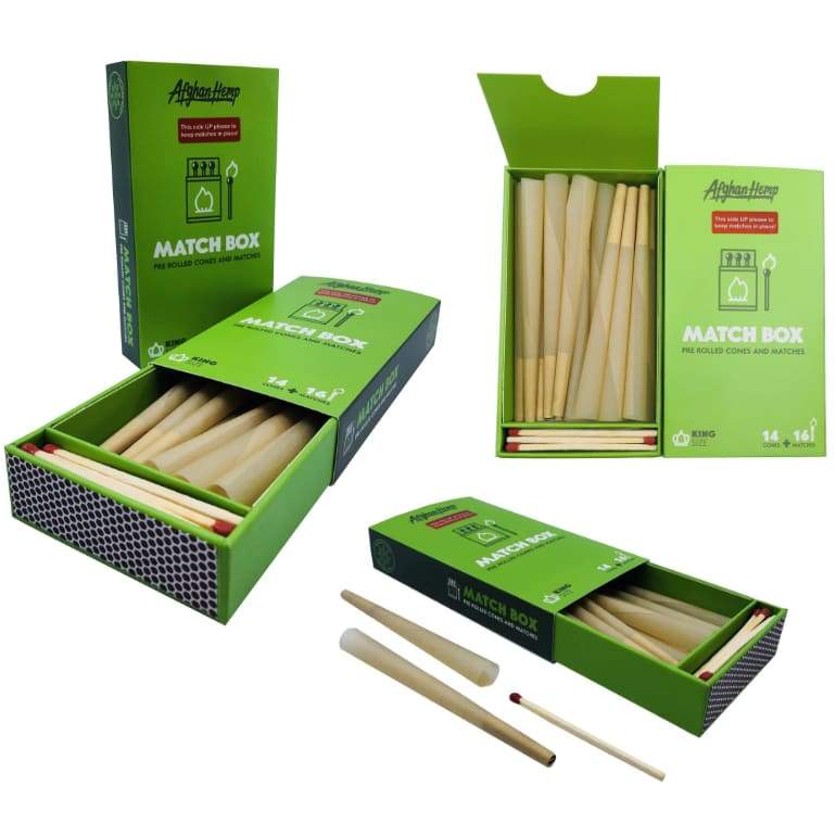 This is the all-new Afghan Hemp matchbox, we incorporated matches into this pack of cones so whether you have a lighter or not you are prepared. You can also use the matches as a way to pack your cones. Features a striker strip on the front sliding end of the box.