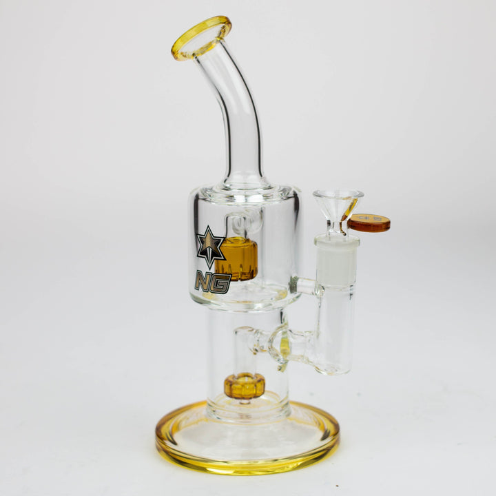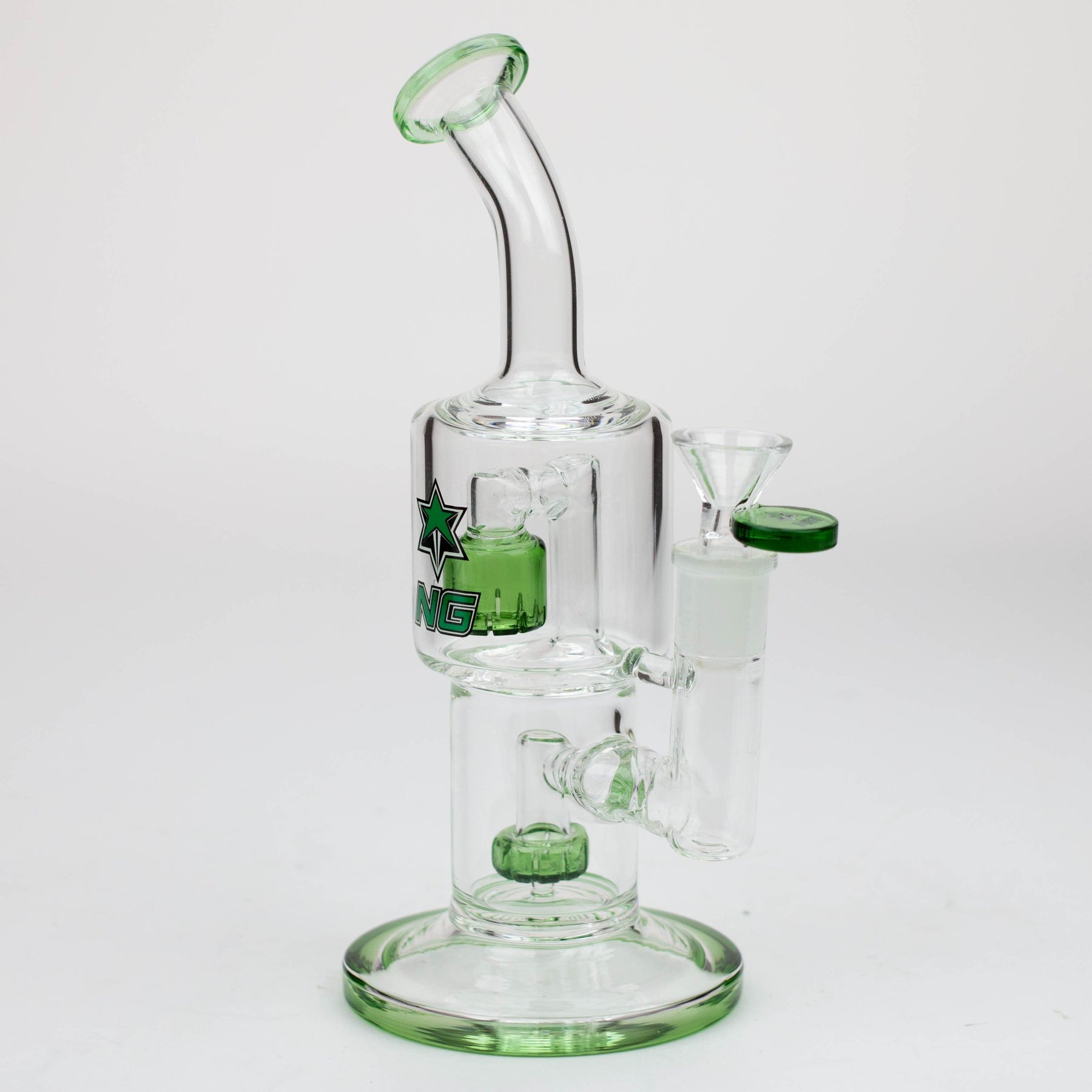 This bubbler packs a double punch. There are two chambers, each with a percolator providing loads of diffusion. The top consists of a drum perc attached to a tube with a 90 degree bend directing the smoke up and then down through the perc. This double aeration system will provide you a smooth and effective hit every time.