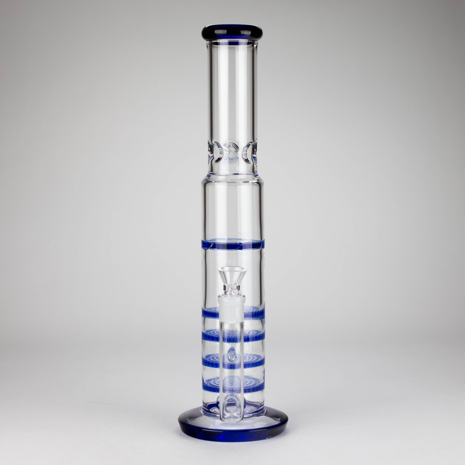 Maximize smoothness and airflow with the 17" Blue Honeycomb Cycler Glass Bong, engineered for clean, cool hits every time. This straight tube stemless bong features four stacked honeycomb percolators, a cycler function, and a sleek blue-rimmed mouthpiece for both style and functionality.