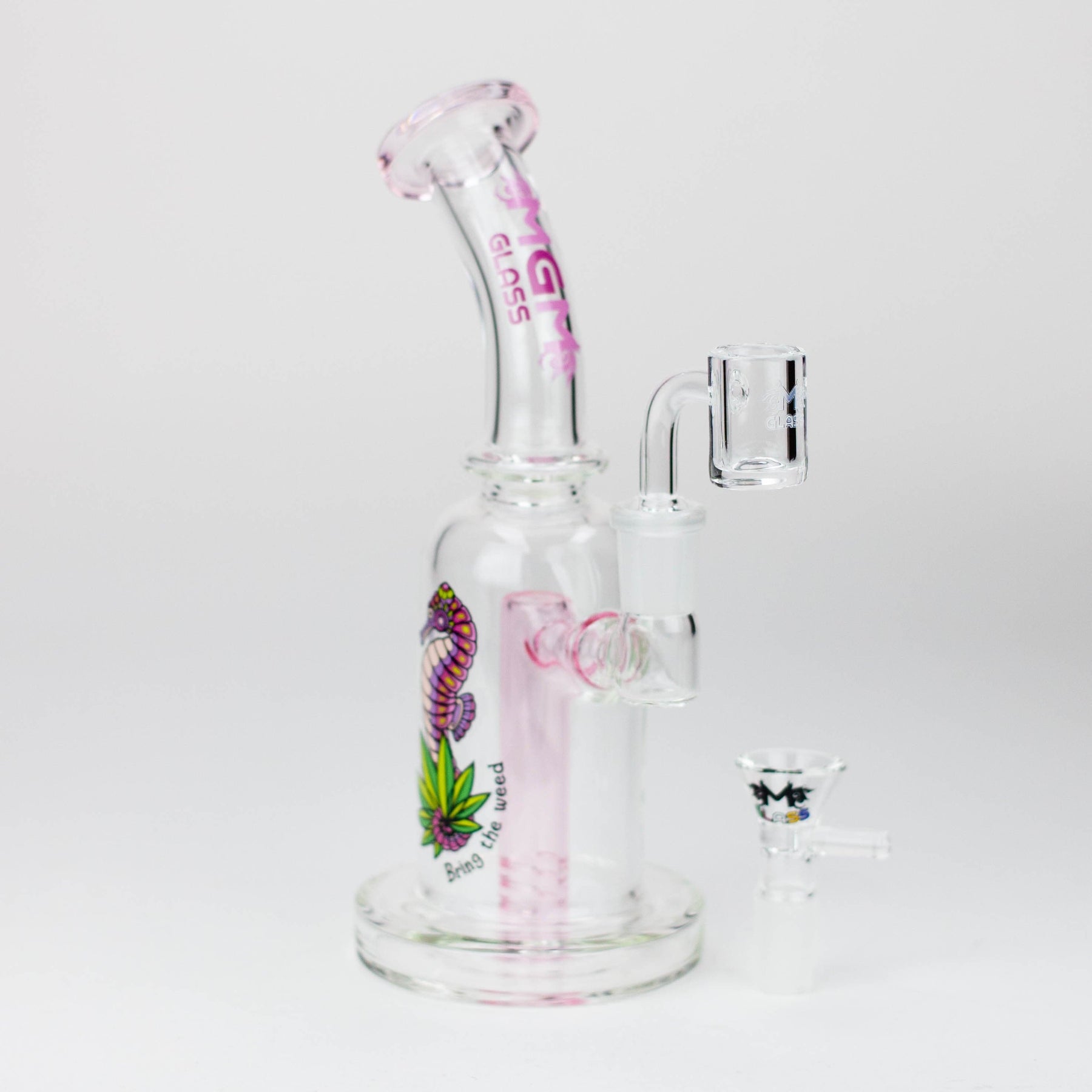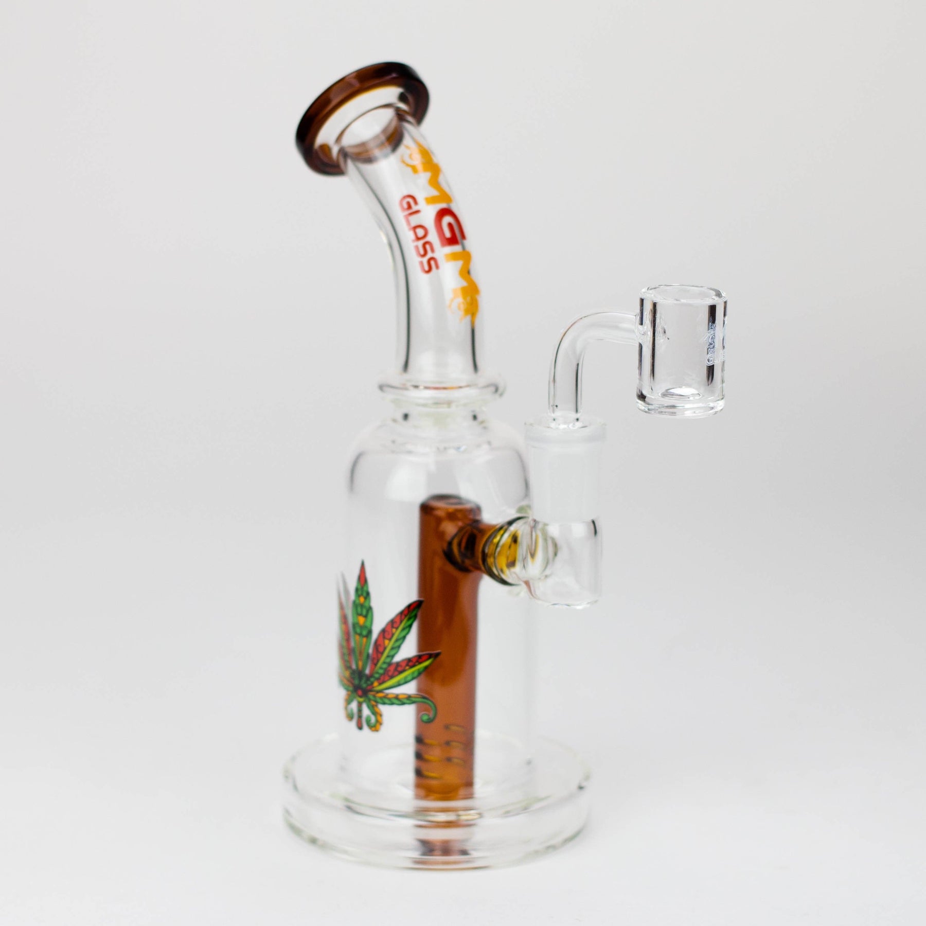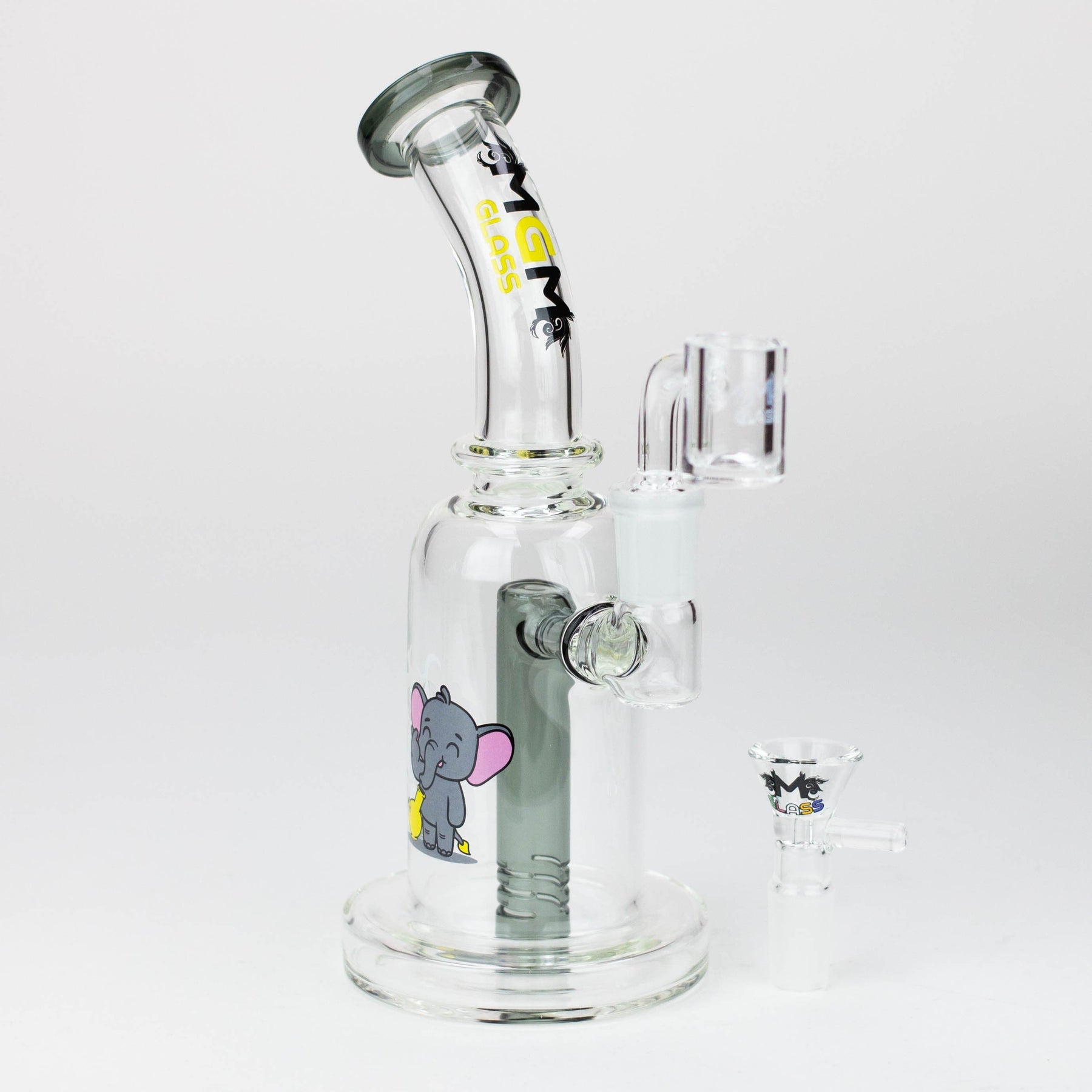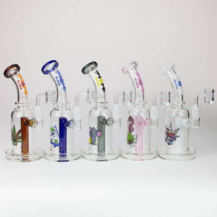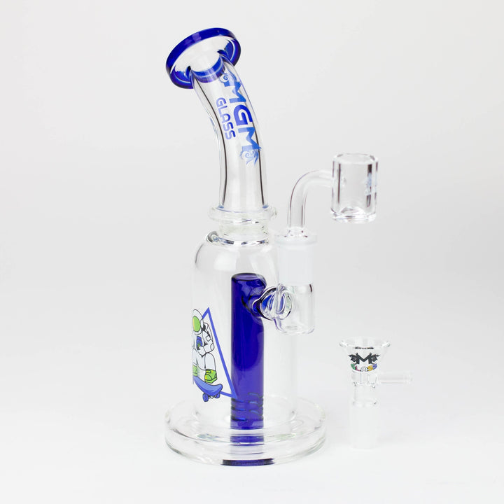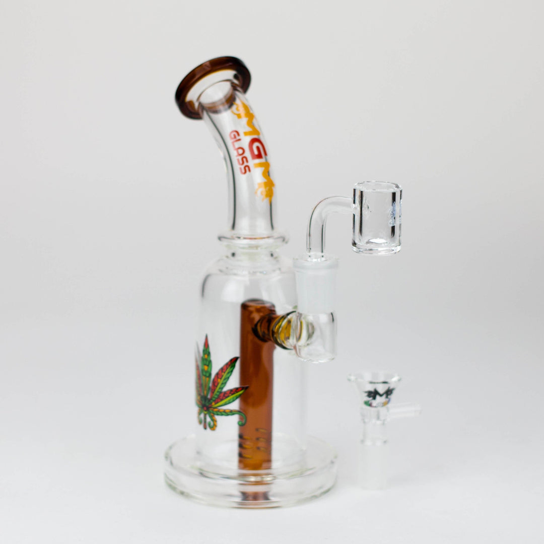 This 5.7" MGM Glass 2-in-1 bubbler boasts an impeccable construction with its quality borosilicate glass and 80 mm base, as well as the thick bowl, quartz banger, and stemless bent neck design. Providing versatility and diversification, this bubbler also comes gifted in a box of an assorted design.