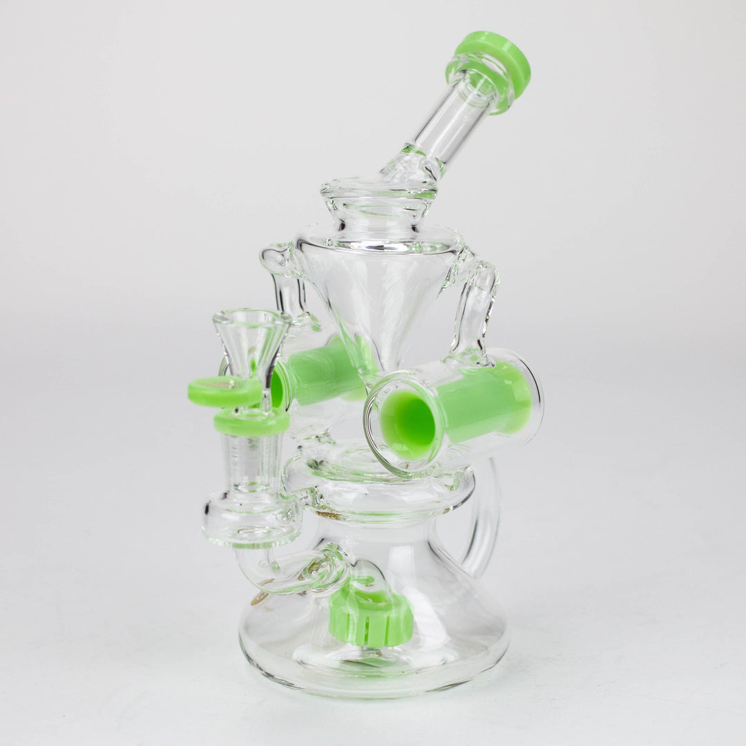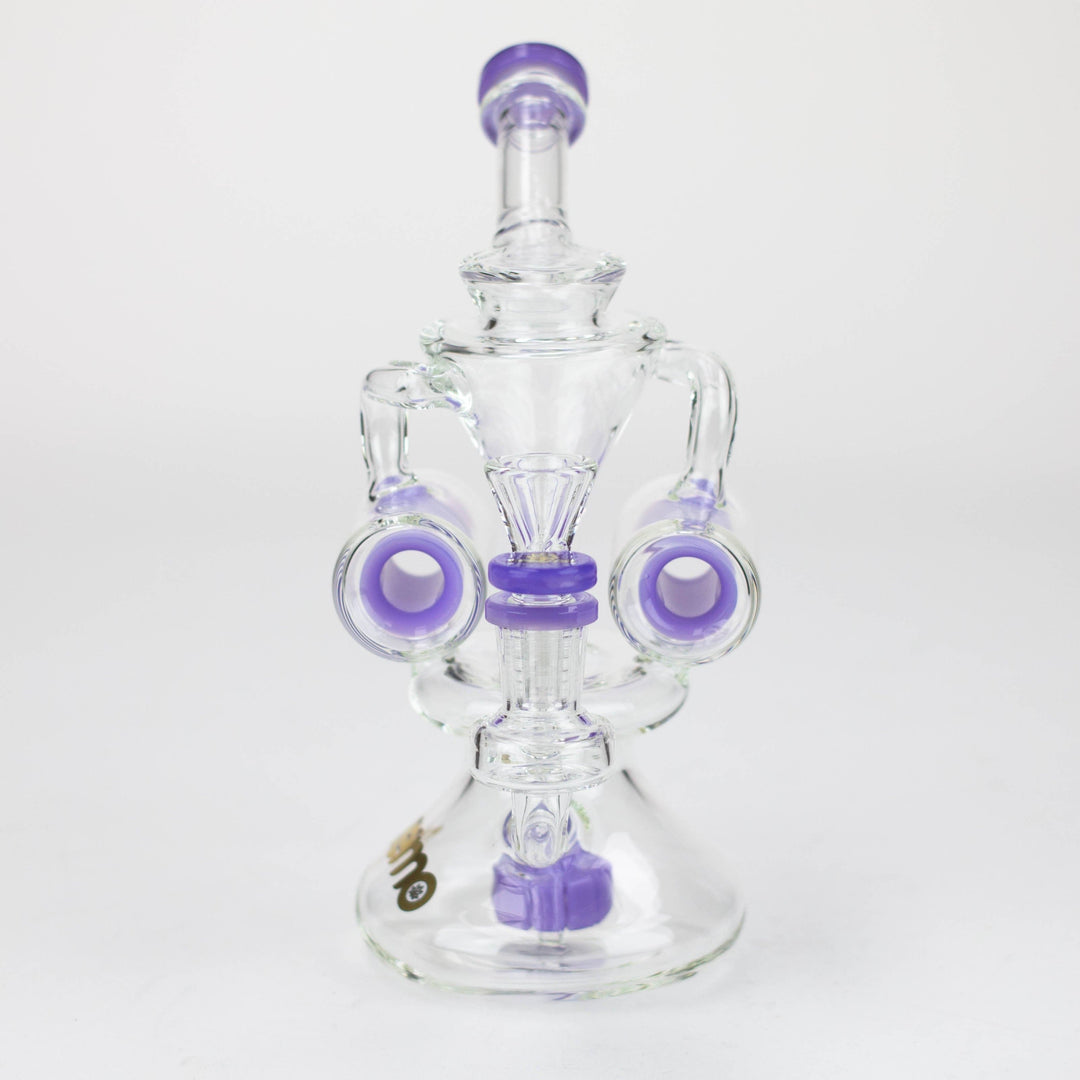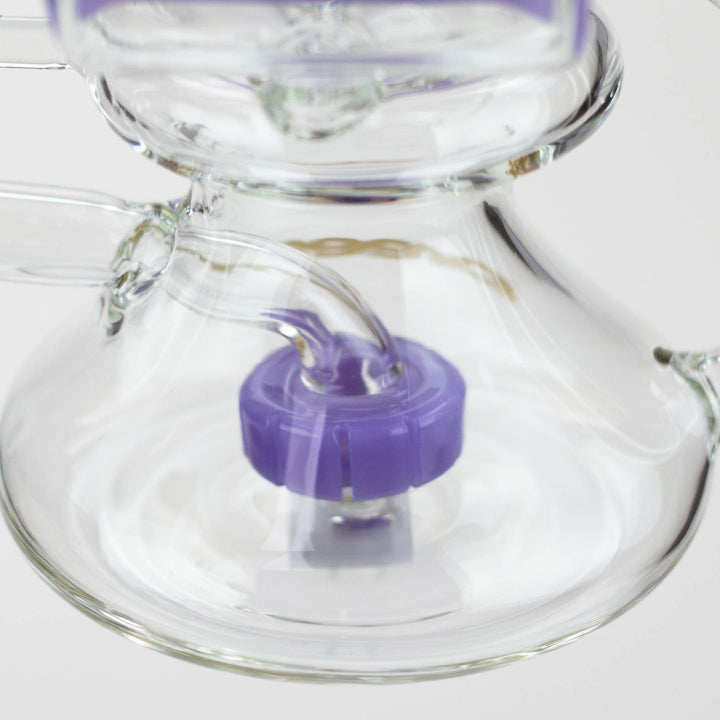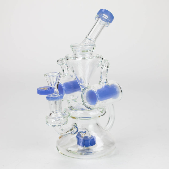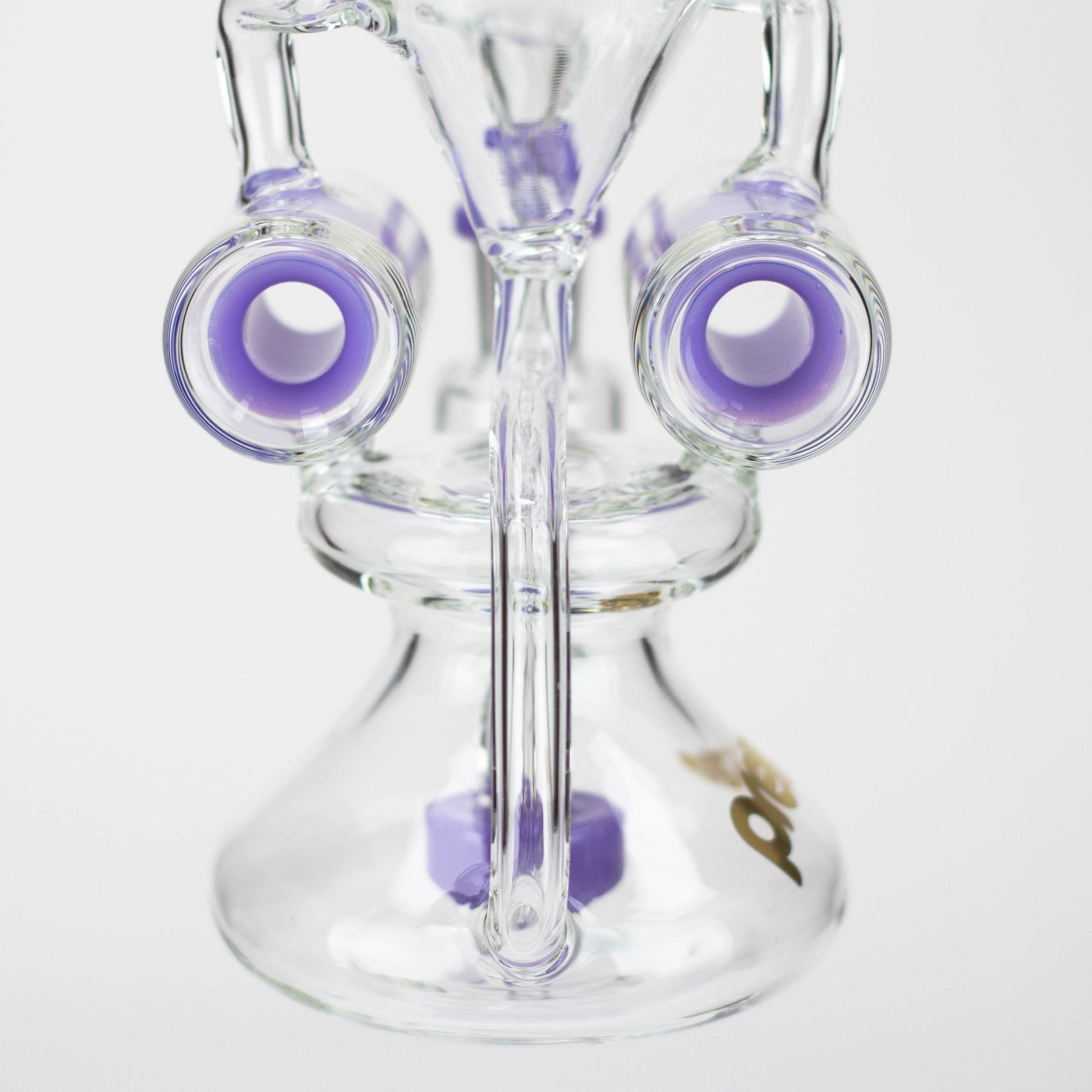 Preemo Glass single stem recycle with unique filtration that features two finger hole percolators. The vapour starts at the drum perc and travels up two stems to through the finger-hole chambers. This creates a larger capacity to cool the smoke. While travelling through this area, the smoke is housed between two glass walls. Before exiting the angled neck, the extra water drops back through the recycler stem to the bottom.