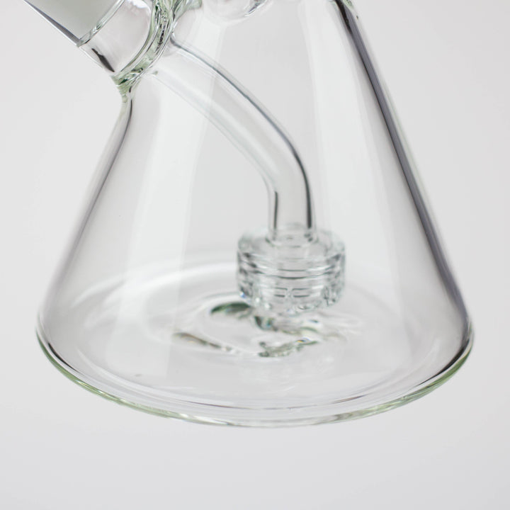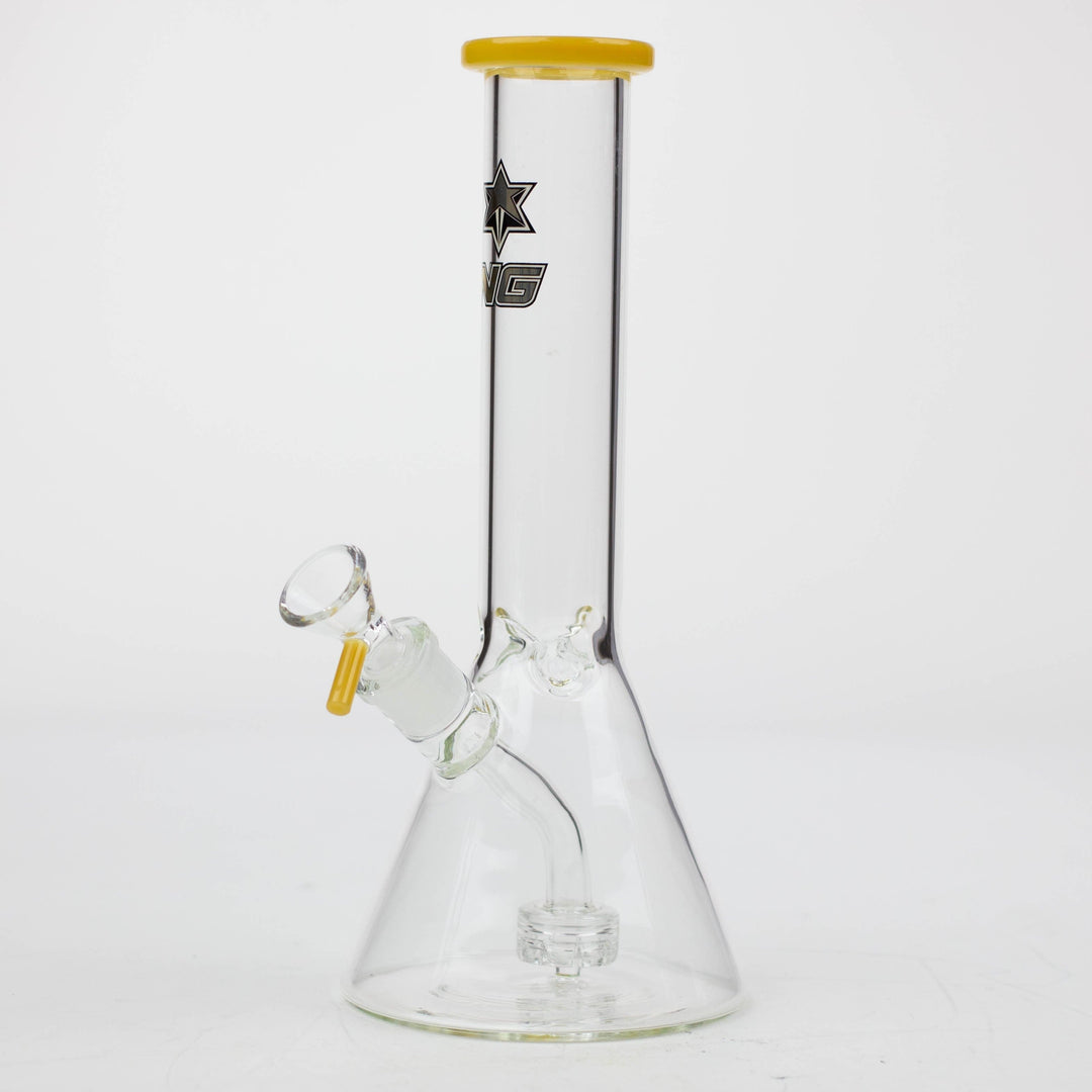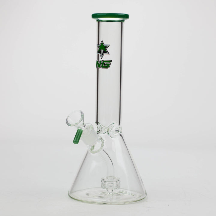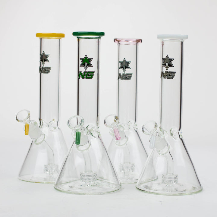Introducing the 10 inch Circ Percolator pipes NG by High-End Brands Glass. This luxurious beaker is sure to make a statement in any room and is the perfect piece to add to your smokeware collection. It features ice notches, a circ percolator, and a starred herb bowl with double roll stoppers in coloured glass to match the rimmed mouthpiece. All of the features are crafted with high-end borosilicate glass, ensuring the highest quality and durability.