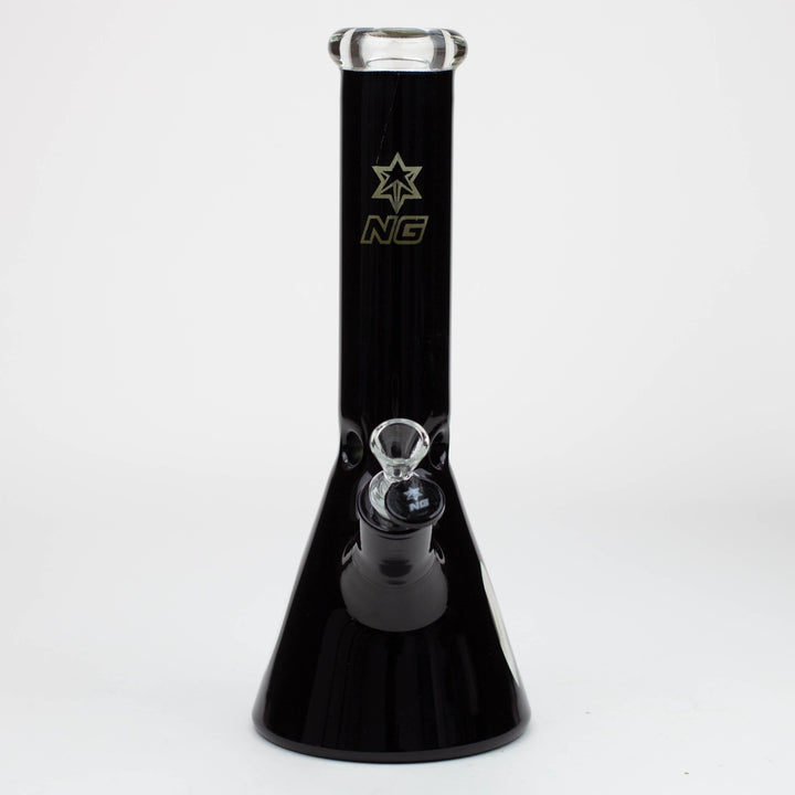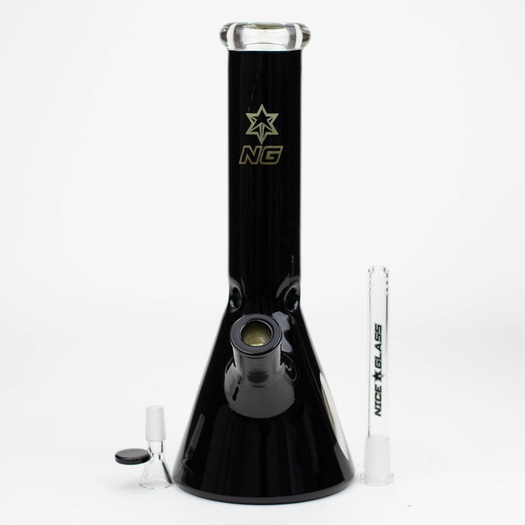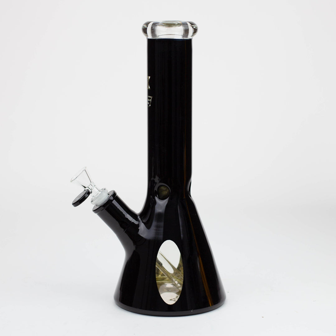 This beautiful 7mm thick beaker is wrapped in semi-transparent metallic with a clear window close to the beaker base to see the filtration in action. The mouthpiece is solid black glass and it comes with a slitted downstem, herb bowl and ice notches placed in just the right position allowing for several cubes to be inserted. It is a very sturdy classic piece with significant weight to it. Available in a range of colour options.