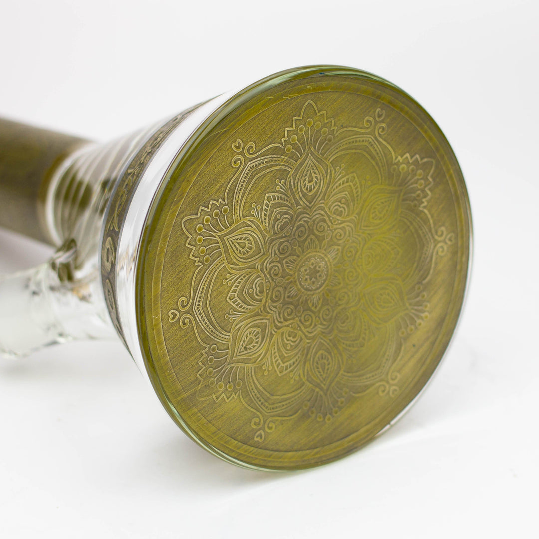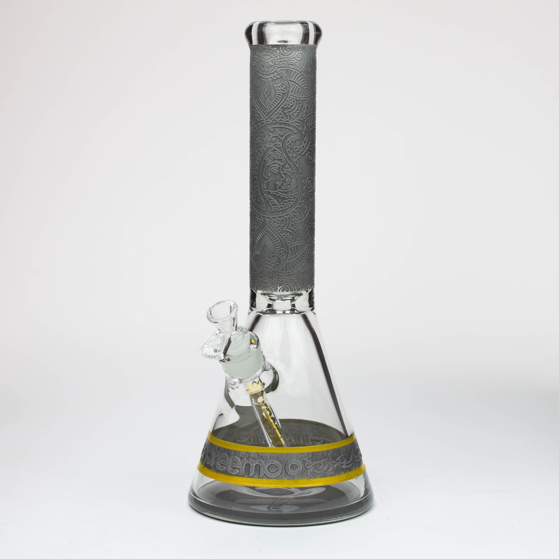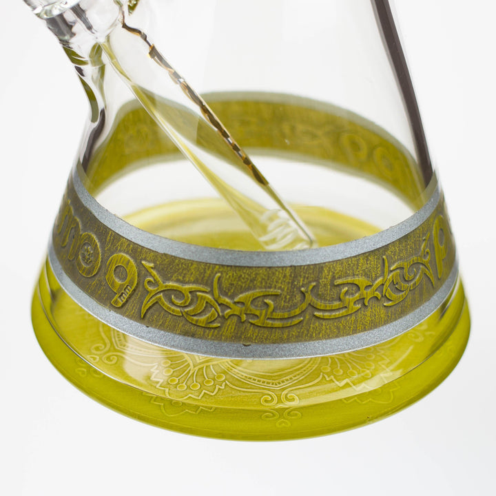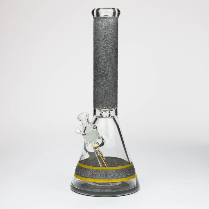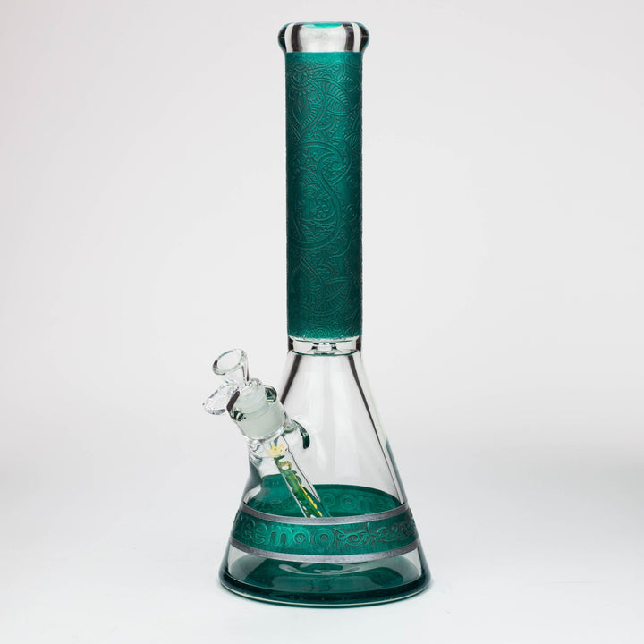 This 9mm thick Preemo beaker features sandblasted flourishes throughout, even on the bottom of the base. The design is then hand-painted with unique colors to bring out the intricate design of the pattern. It is a super strong piece that comes with a diffuser downstem and herb bowl. Notice that the roll stopper tab is connected at the bowl (as opposed to the bowl base) which has a stronger joint.