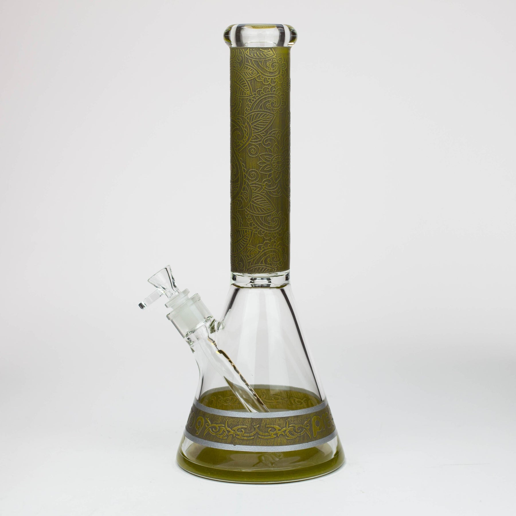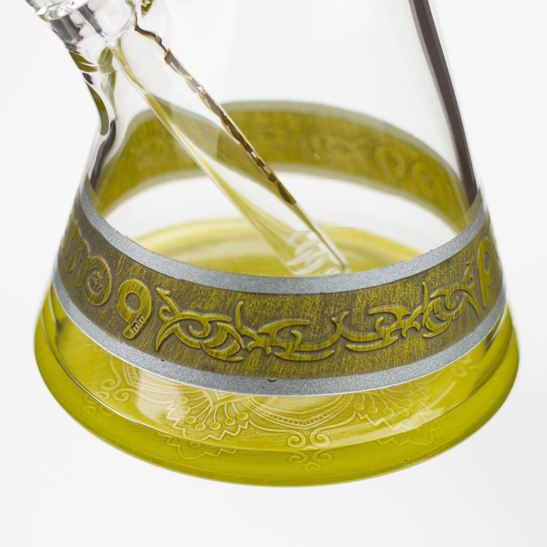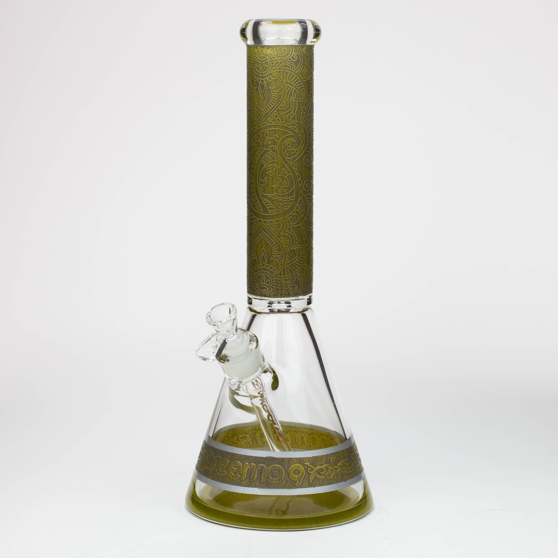This 9mm thick Preemo beaker features sandblasted flourishes throughout, even on the bottom of the base. The design is then hand-painted with unique colors to bring out the intricate design of the pattern. It is a super strong piece that comes with a diffuser downstem and herb bowl. Notice that the roll stopper tab is connected at the bowl (as opposed to the bowl base) which has a stronger joint.