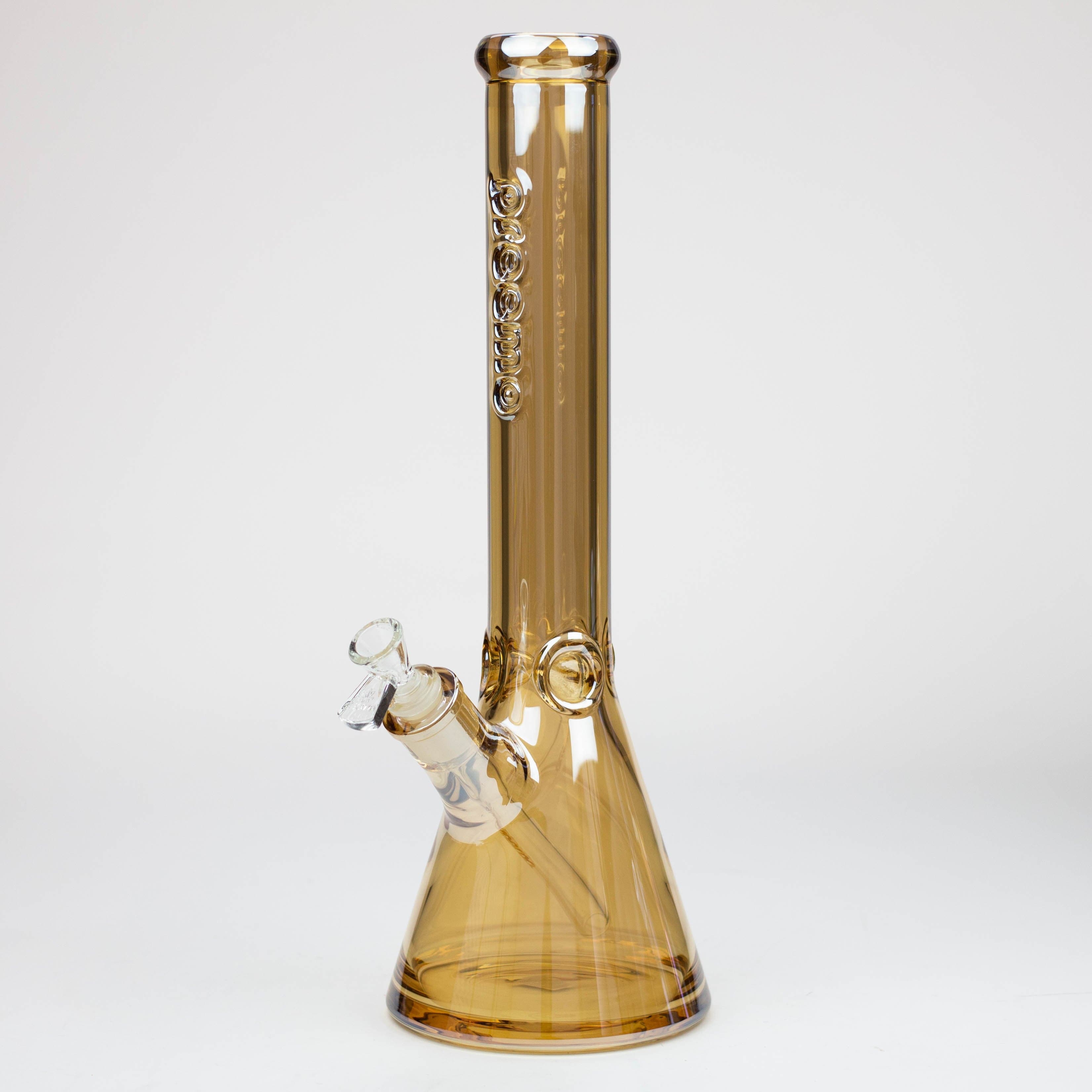 This is an elegant Preemo clear beaker bong with the logo embossed on the tube. The glass is 9mm thick and super sturdy. It comes with a herb bowl, ice pinches and an open-ended down stem. If you want a simple and classic beaker, don't pass up on this beauty. You must see them in person to appreciate the color dimensions.Colors are applied through an ion plating process which is super durable and lasts longer than other methods, excluding color glass. Their true dynamic colors are not shown in photo. It is also available in clear and 12 inch versions