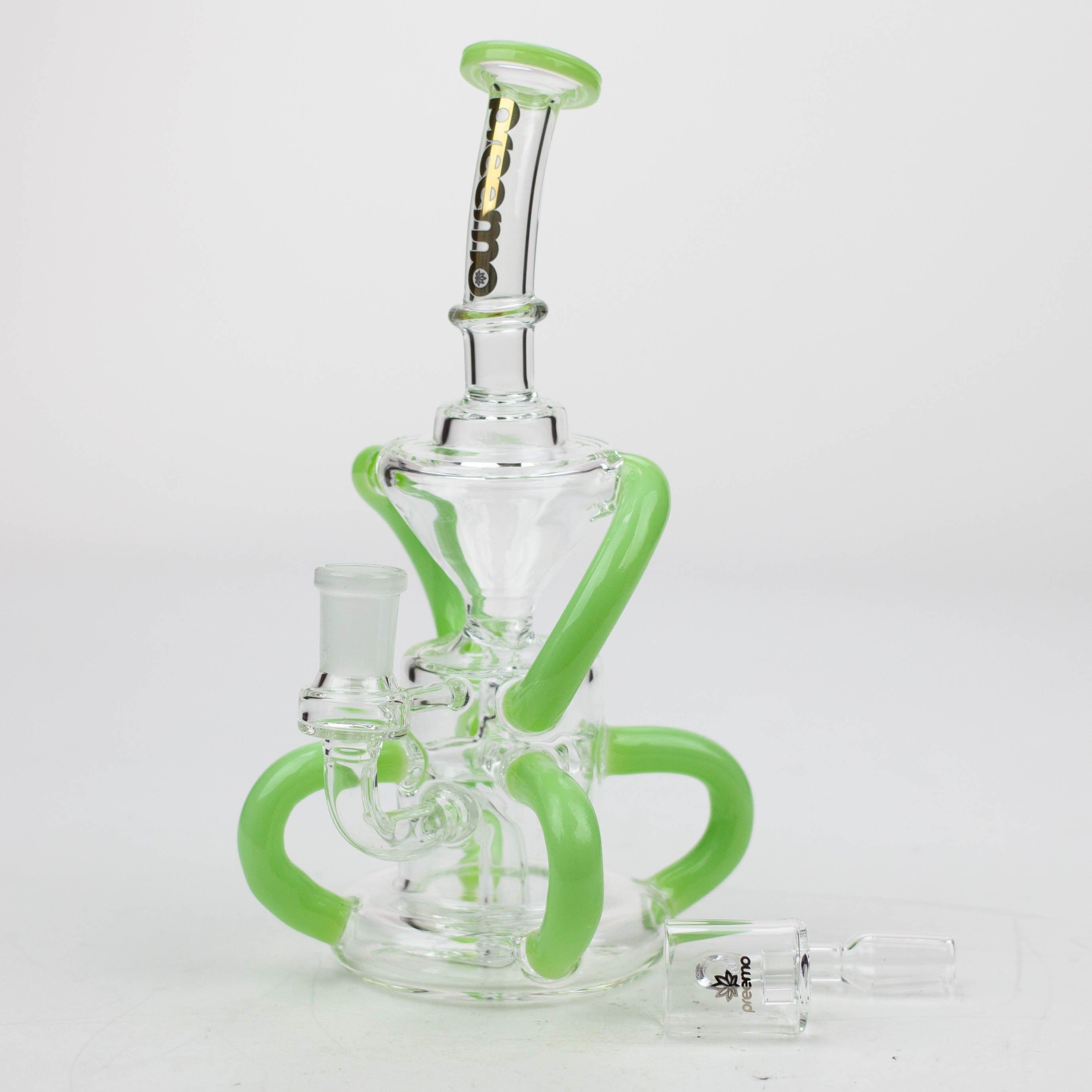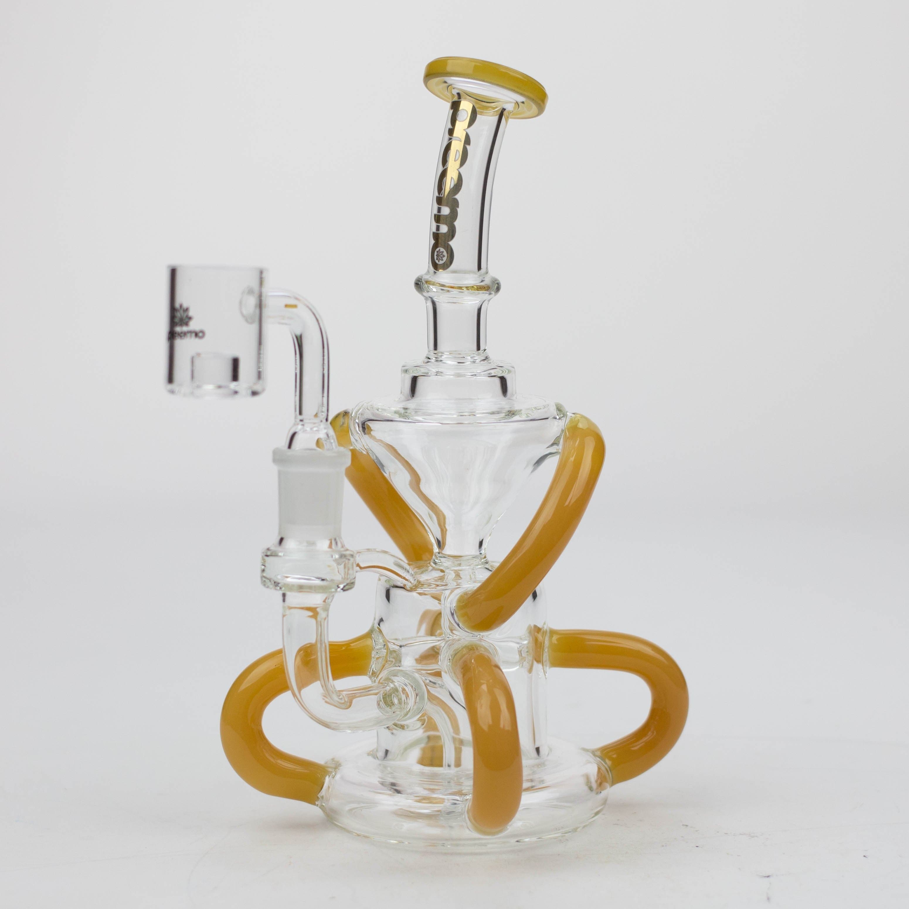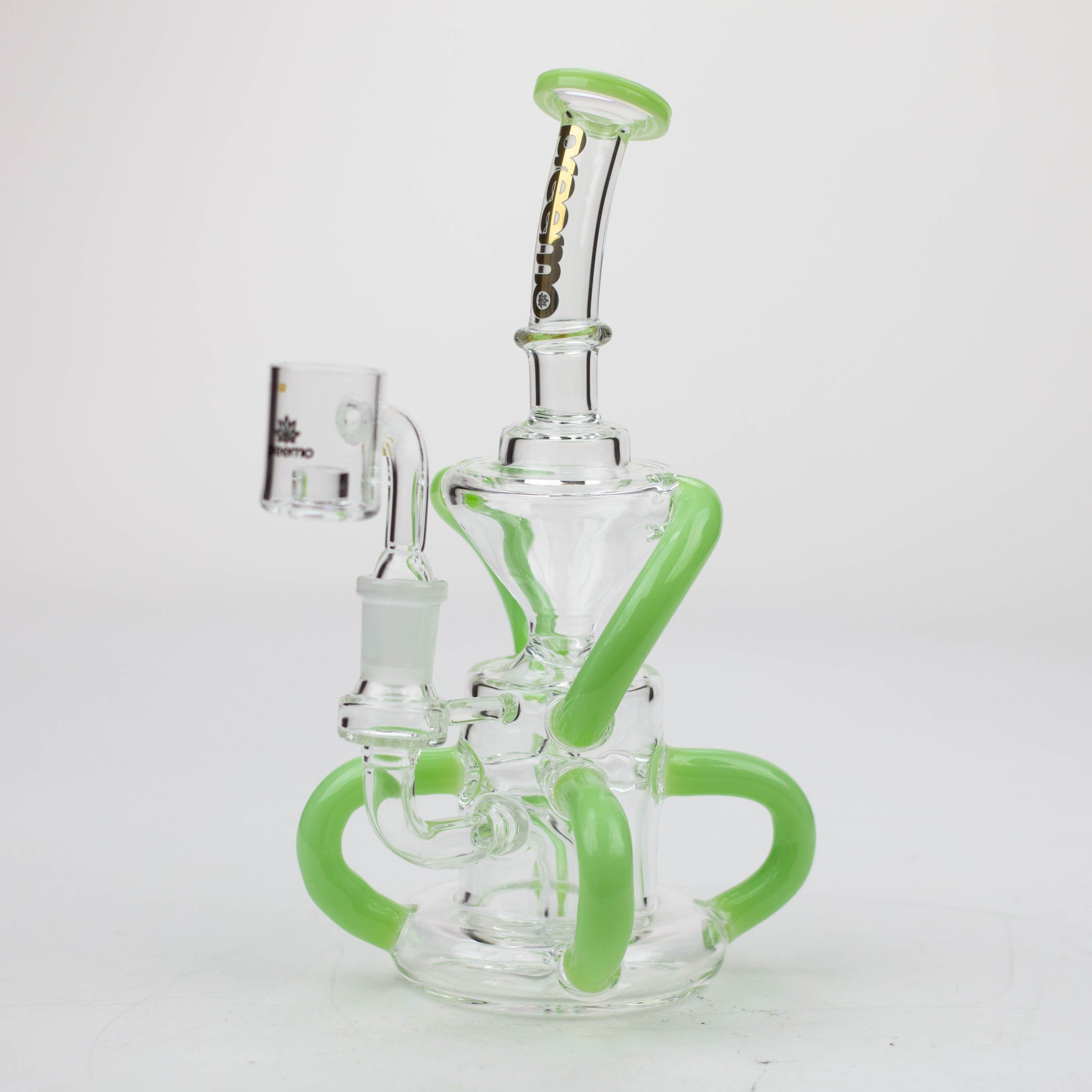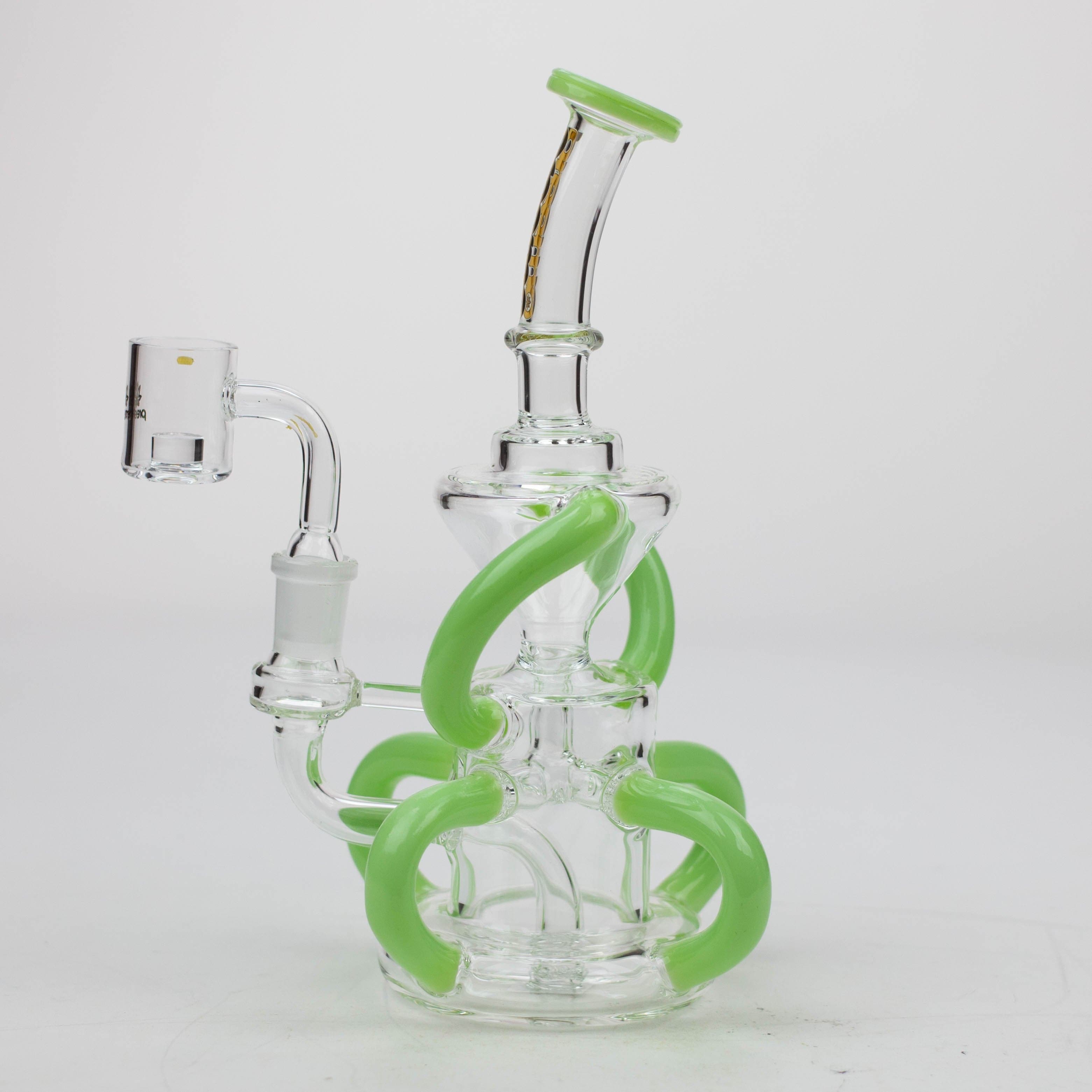 Cross stems recycler with quartz banger. This rig is fully loaded when it comes to recyclers. The multiple actions guarantee a cleaner and smoother hit. Check out the function of the four stems crossing in the first chamber.