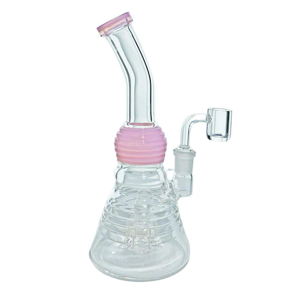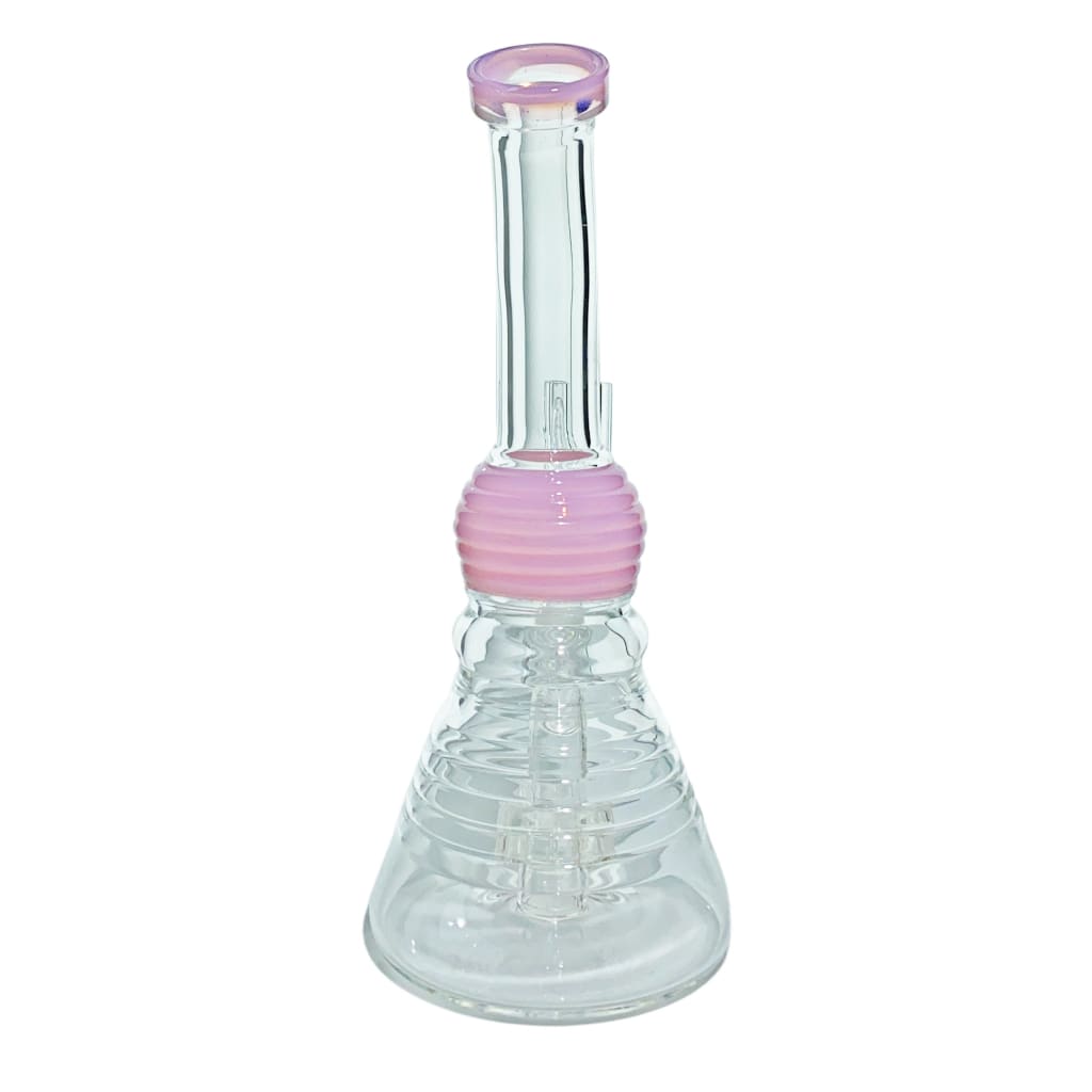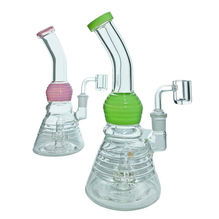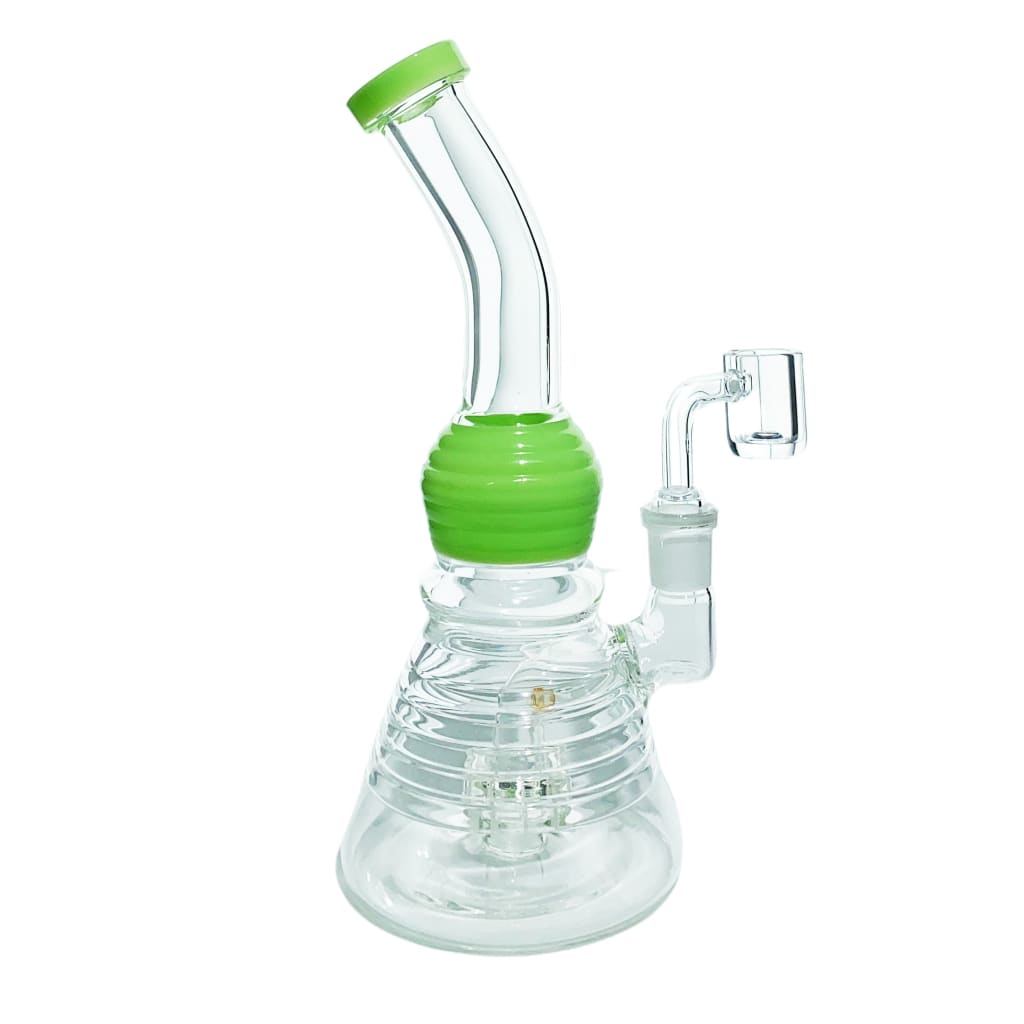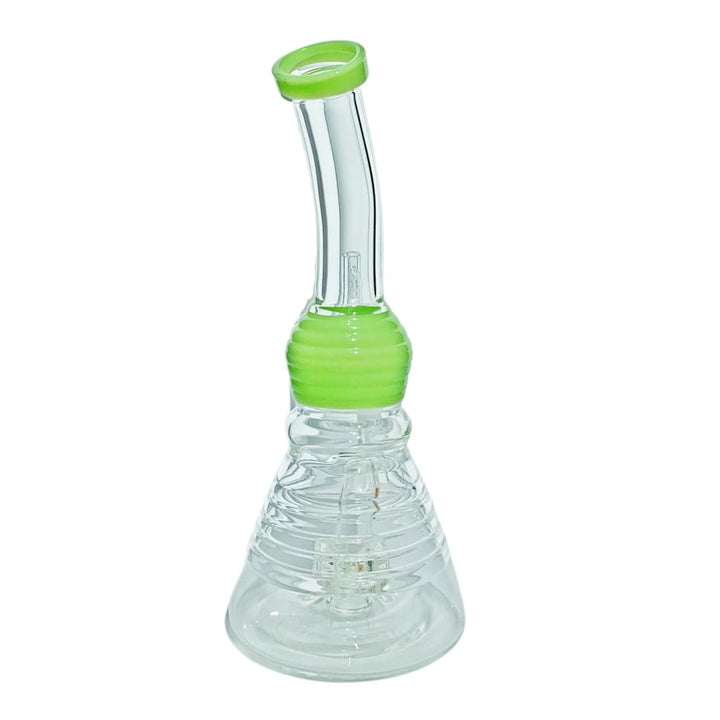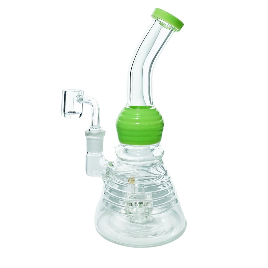The curved neck is adorned with a Solid color design that matches the design on the outside bottom of the beaker base. The colors on both ends of the neck and the pipe's 14 mm female joint make this bong a real standout piece. The whole pipe is constructed of high-quality thick glass. Included is a 14 mm banger.