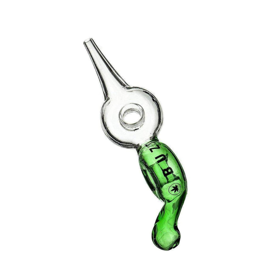 Nectar collector weed pipe made by Buzz Glass, with a double donut design and a curved nozzle for greater comfort, includes the Buzz logo on one side. In this nectar collector design, the steam passes through the two hollow chambers and condenses on the curved nozzle. The Nectar Collectors works by heating the tip to between 160 and 210 ° C to generate steam by contacting the nectar.