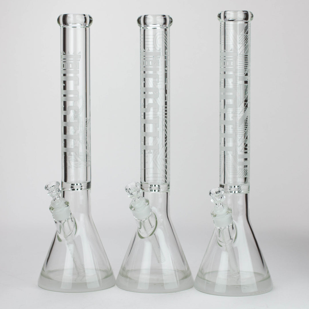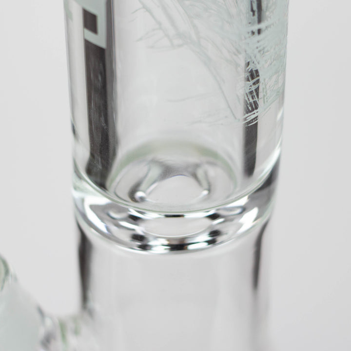 Introducing our Sandblasted graphic beaker, the perfect blend of elegance and durability. Crafted from premium quality borosilicate glass, this bong boasts a 12mm thick and 5 inch wide base, making it a sturdy and reliable option for all our smokers out there.