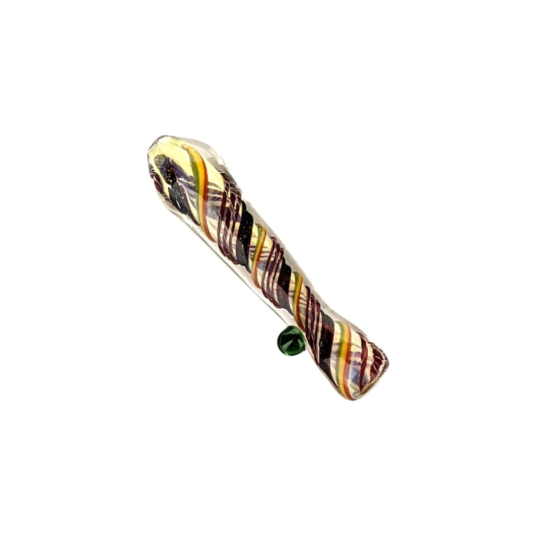 This piece is a chillum-style weed pipe featuring a simple design of inside-out Rasta colors and gold fuming throughout for a nice color-changing appearance with use.