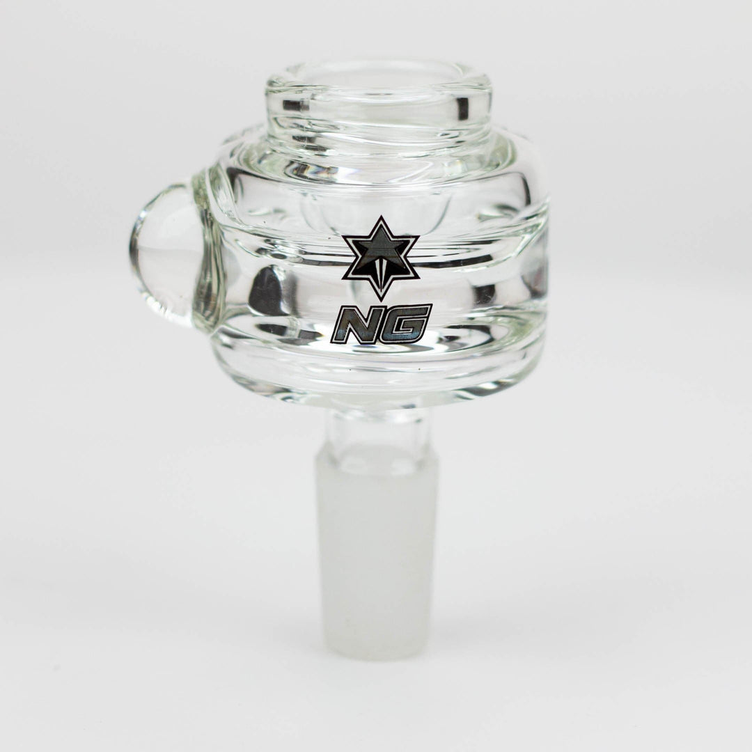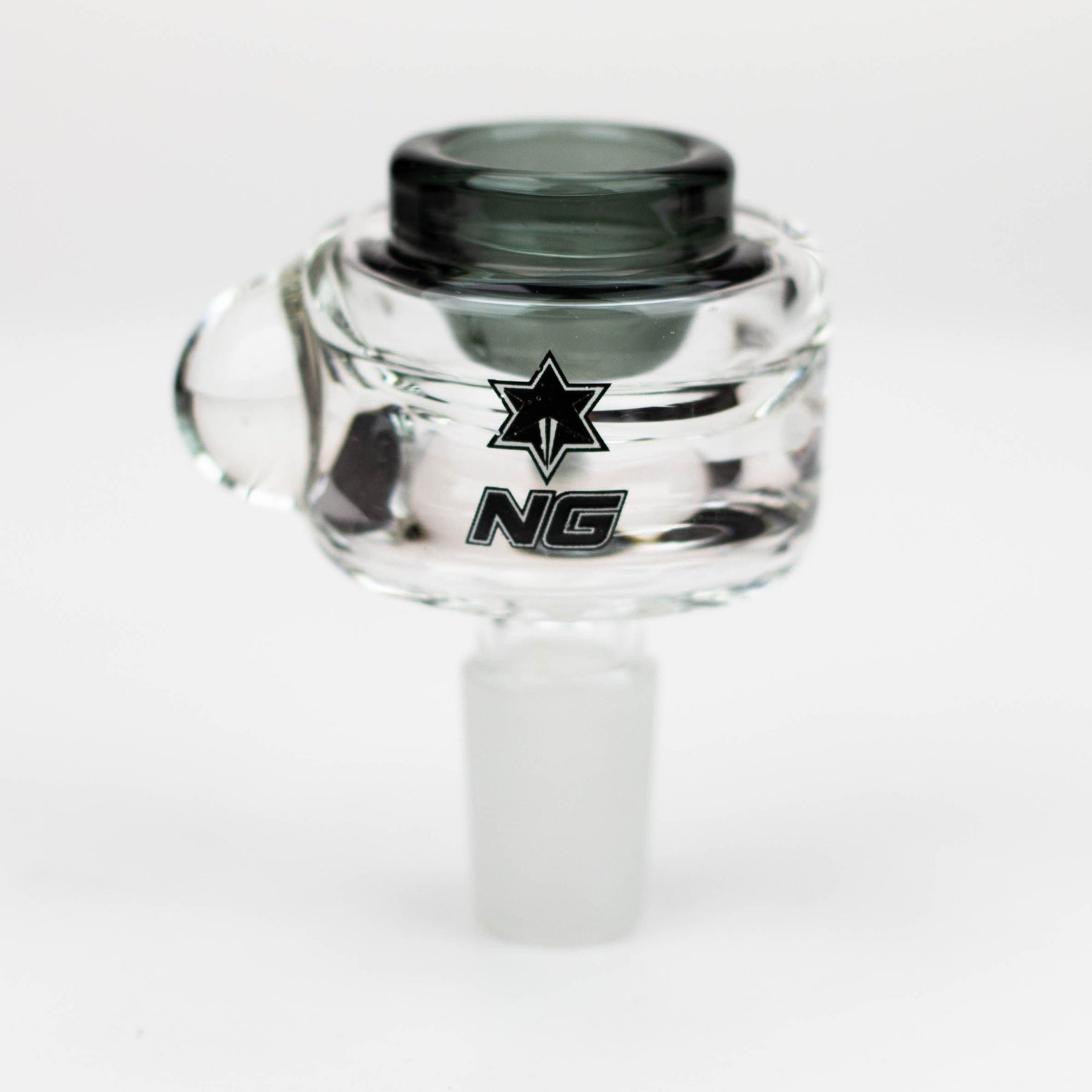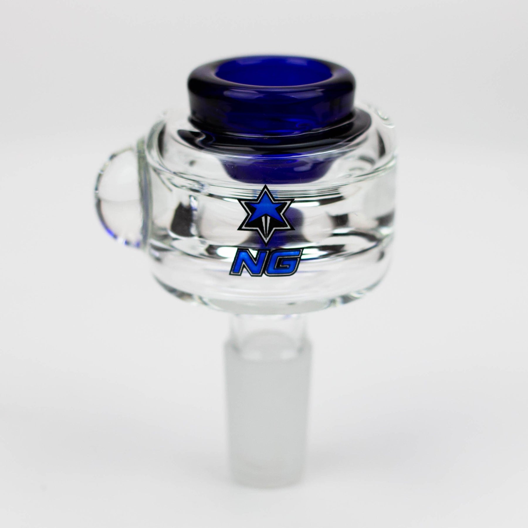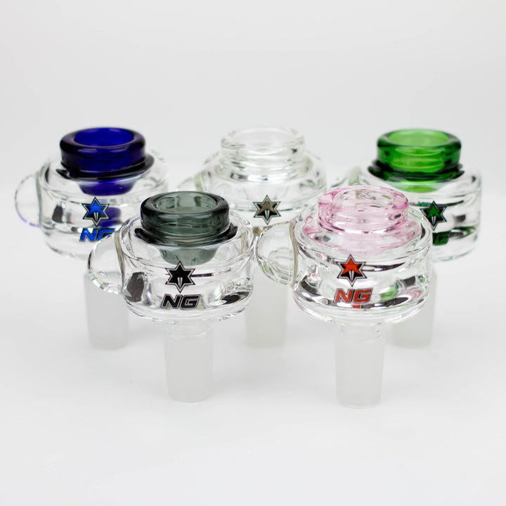 A quality thick clear glass bowl with single hole colour inset for the herb. It has a glass marble that functions as a roll stopper and comes in a range of colour options.