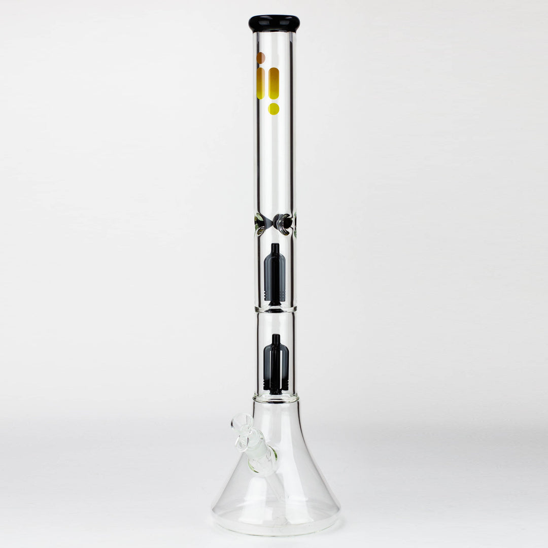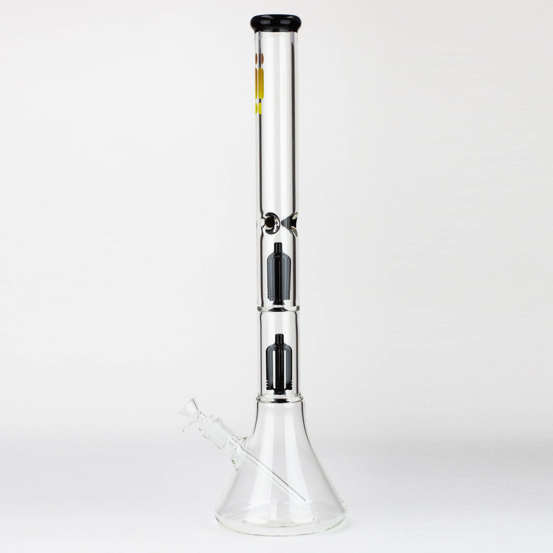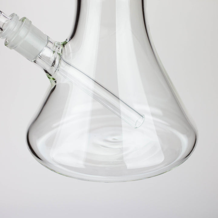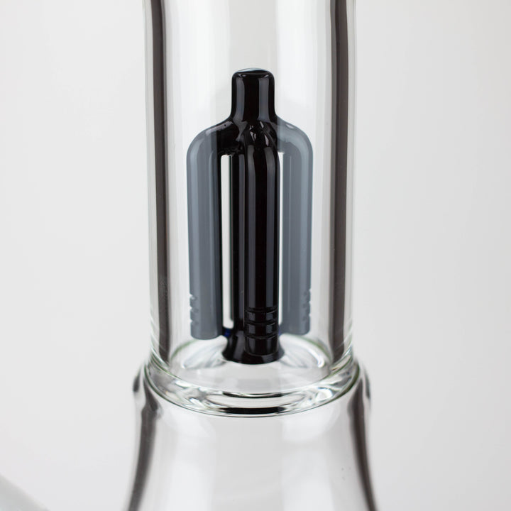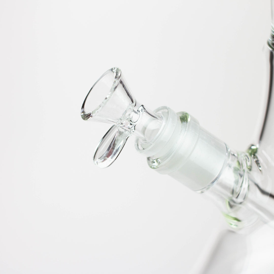 This 24" beaker bong is made from high-quality borosilicate glass with a thickness of 7mm. It features a 6.5" wide base, a 2" tube diameter, three pinch ice catchers, and dual tree arms percolator for maximum water diffusion. The robust bowl offers a 14 mm female joint and comes with a 6" long downstem.