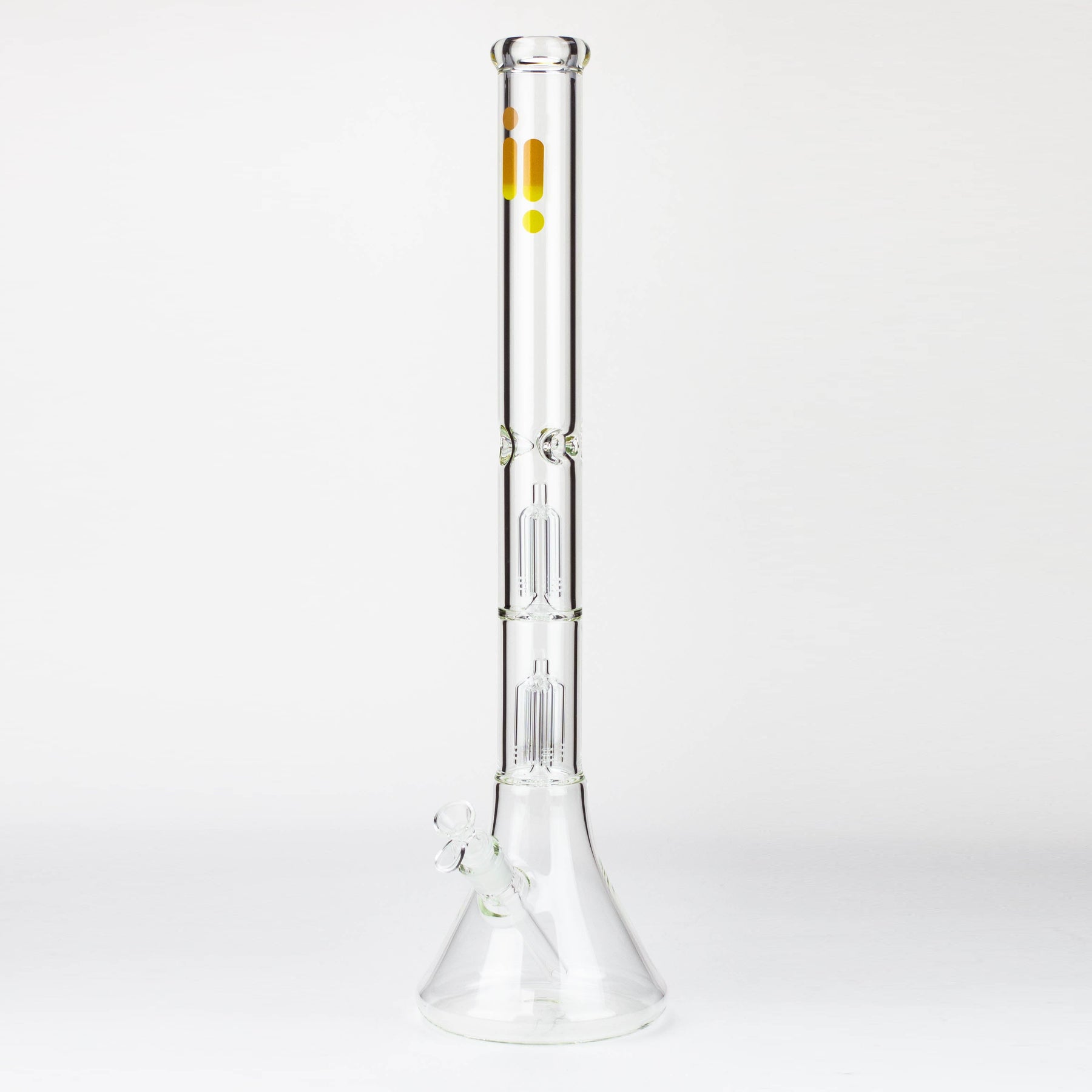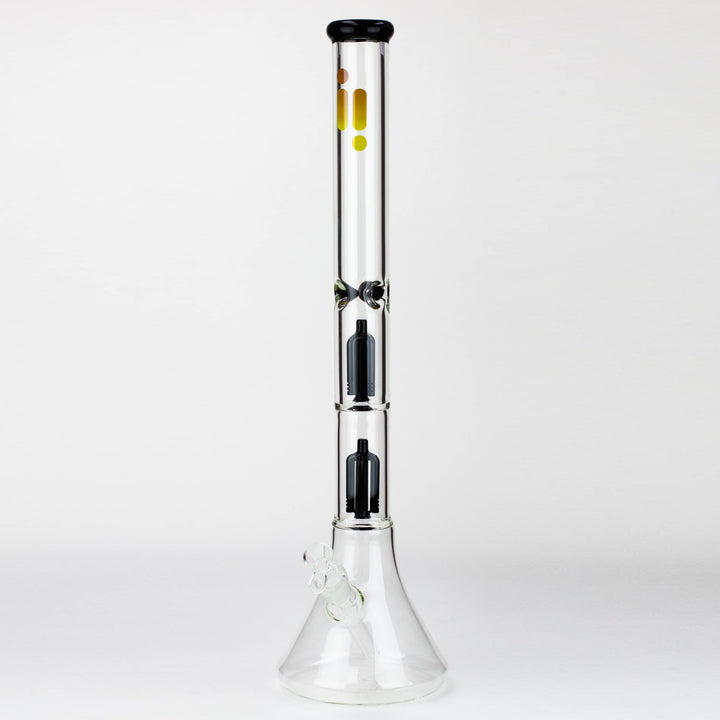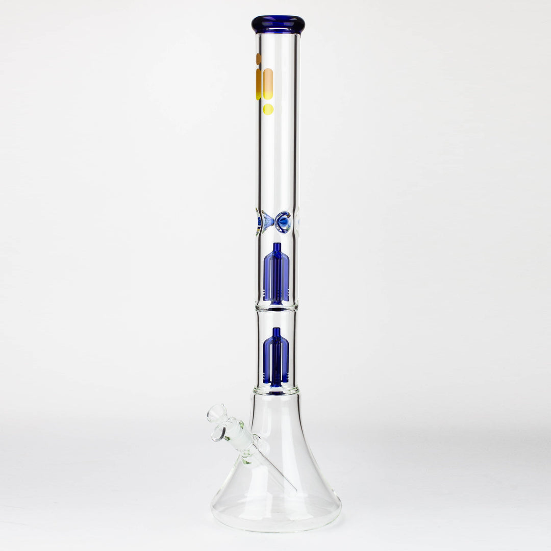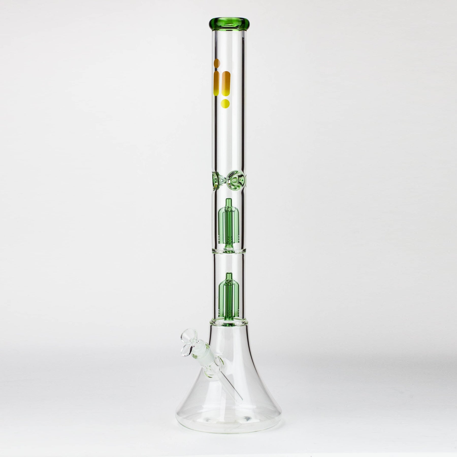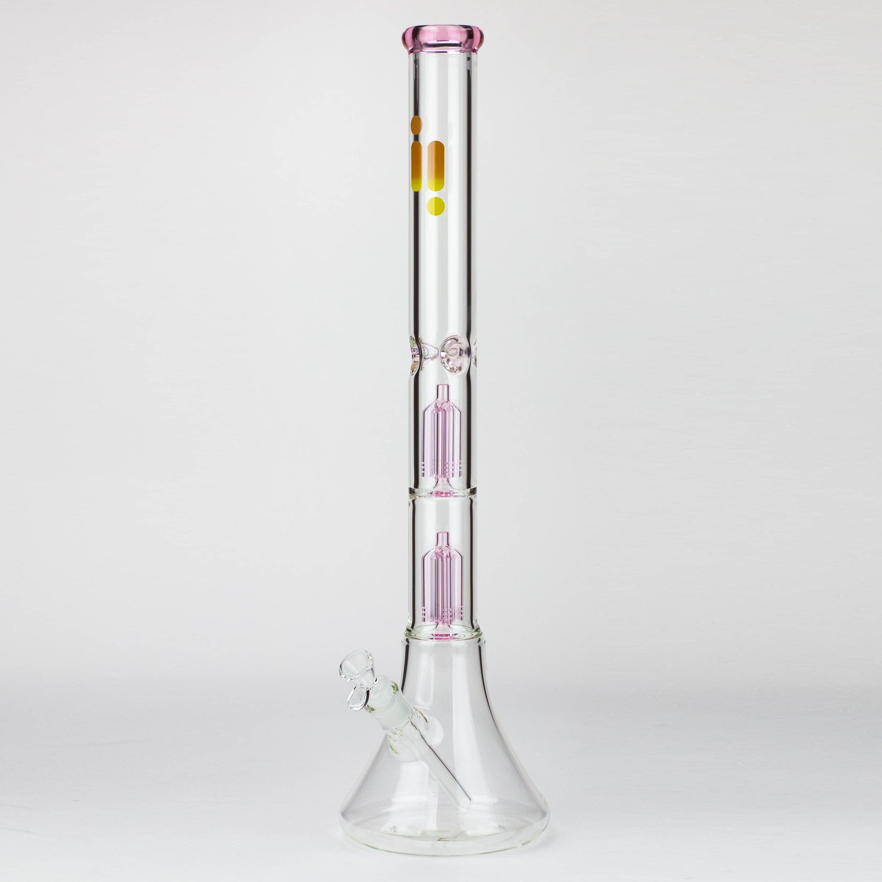 This 24" beaker bong is made from high-quality borosilicate glass with a thickness of 7mm. It features a 6.5" wide base, a 2" tube diameter, three pinch ice catchers, and dual tree arms percolator for maximum water diffusion. The robust bowl offers a 14 mm female joint and comes with a 6" long downstem.
