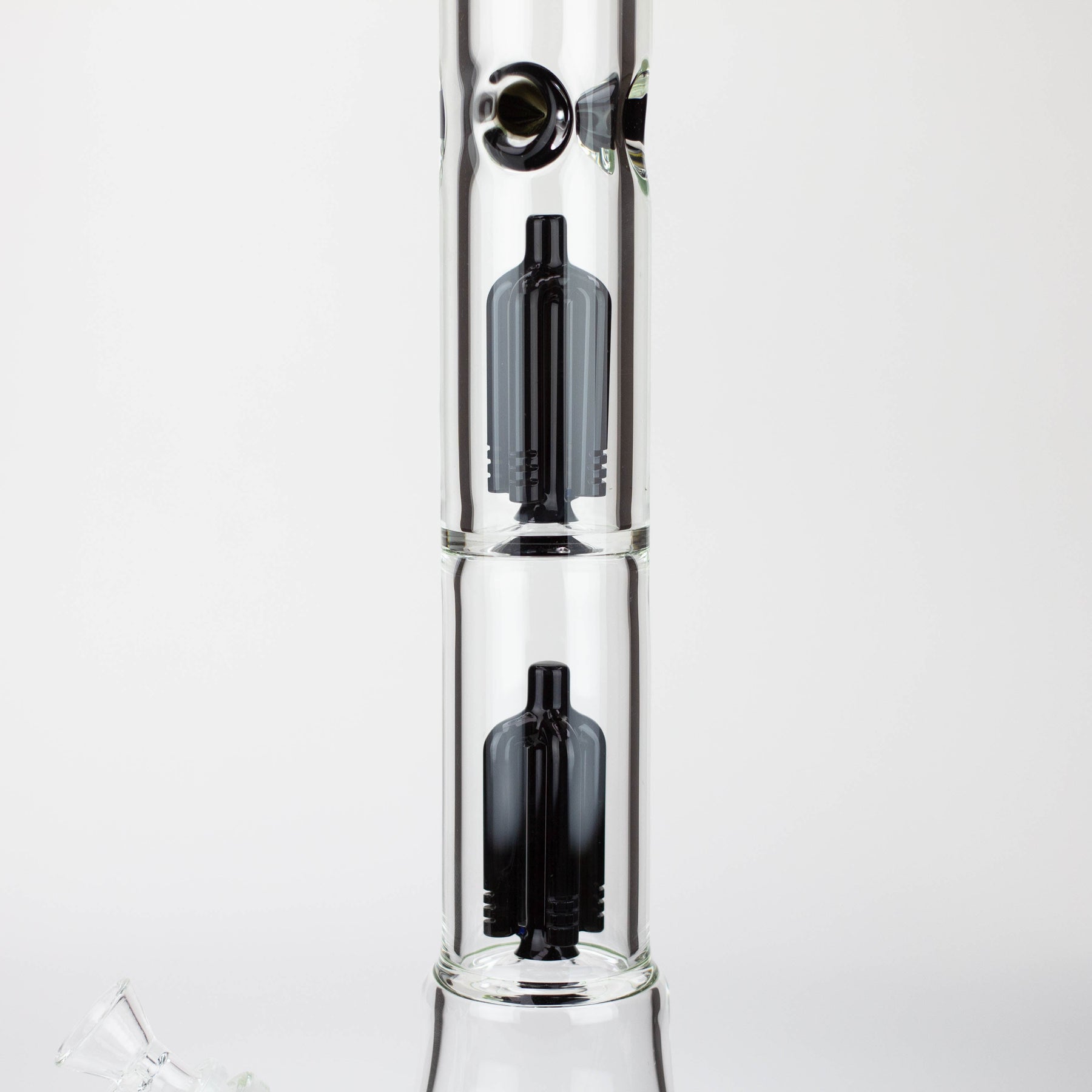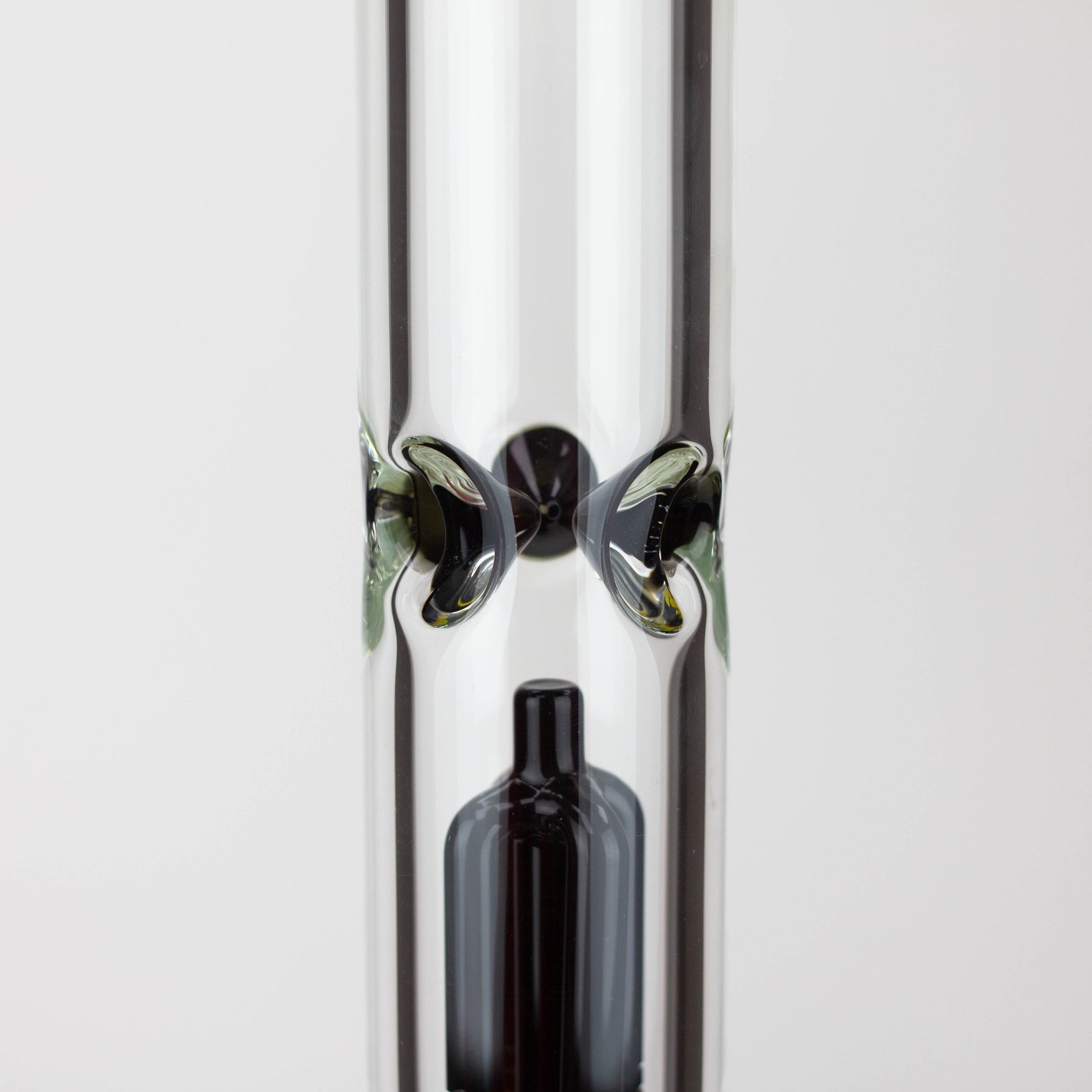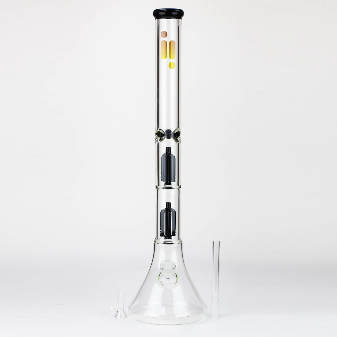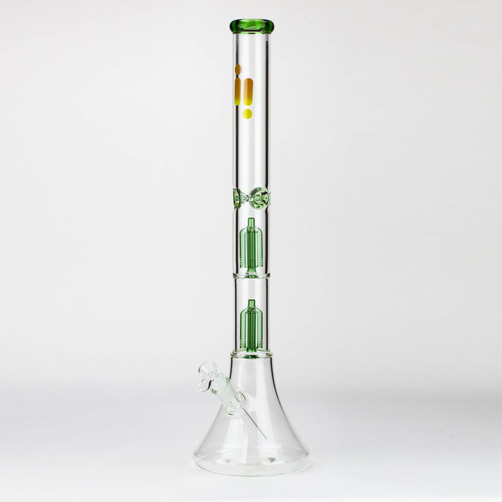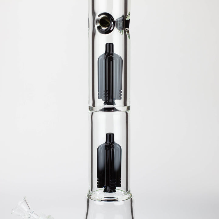 This 24" beaker bong is made from high-quality borosilicate glass with a thickness of 7mm. It features a 6.5" wide base, a 2" tube diameter, three pinch ice catchers, and dual tree arms percolator for maximum water diffusion. The robust bowl offers a 14 mm female joint and comes with a 6" long downstem.