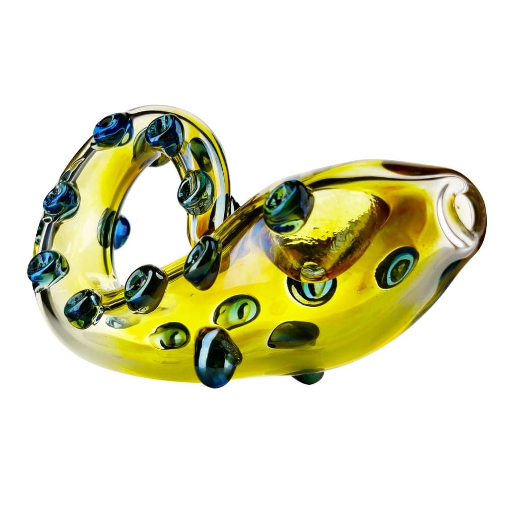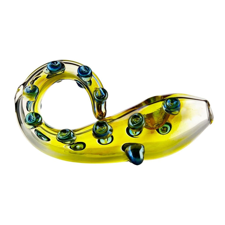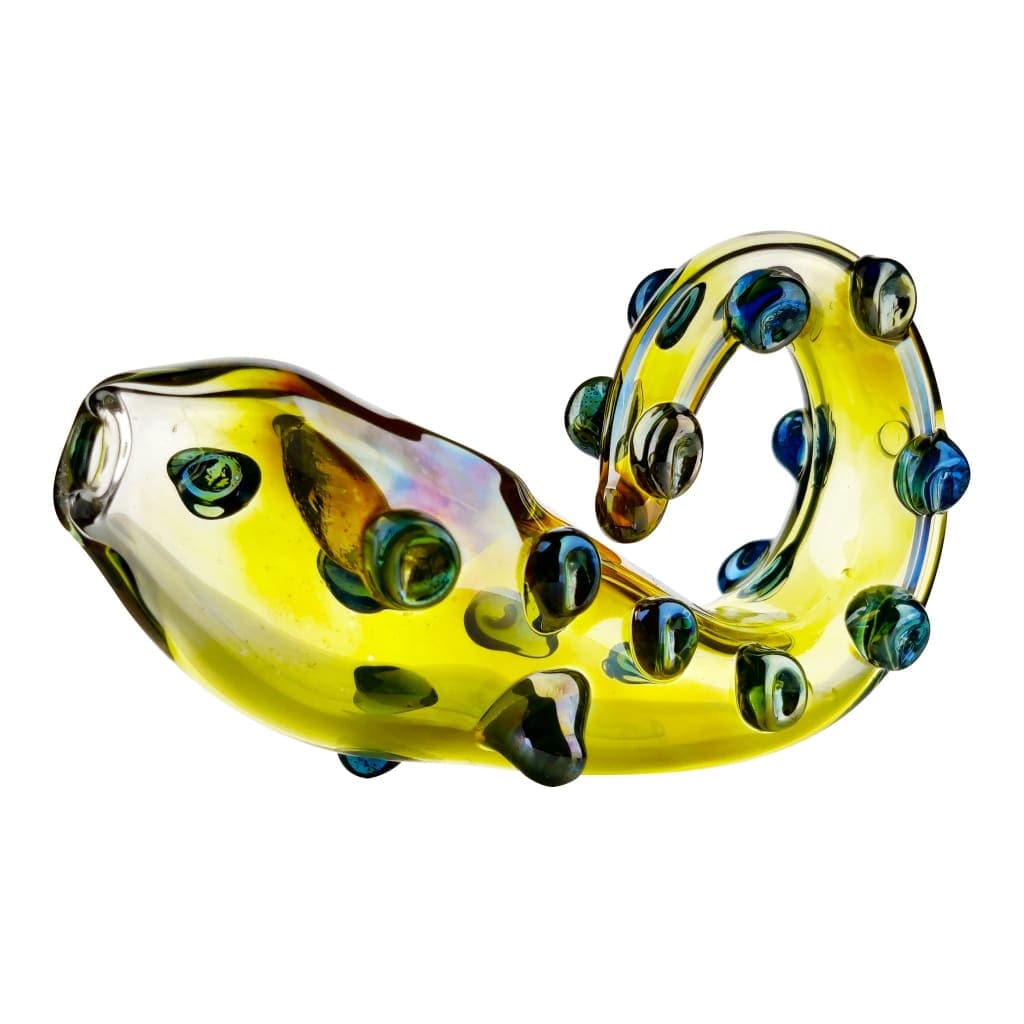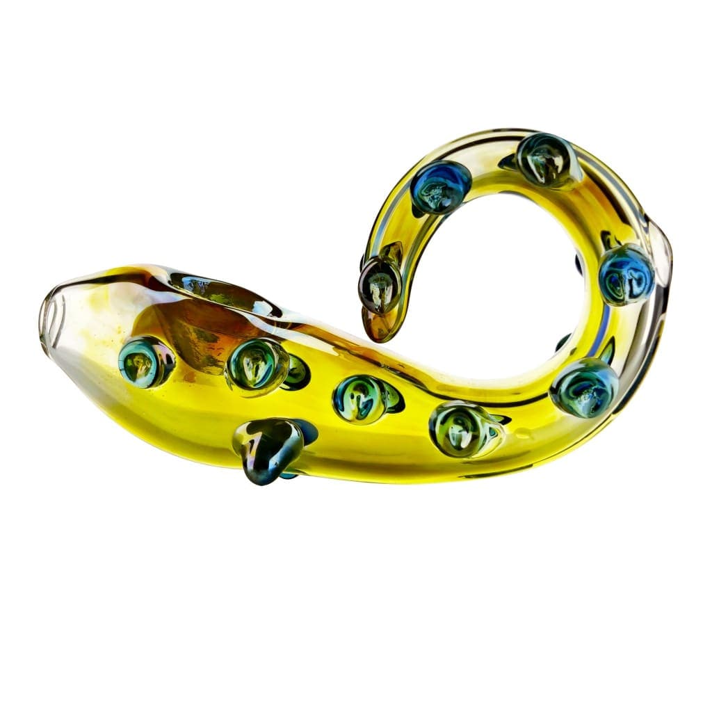 These Kraken glass pipes sit in the palm of your hand at just 3.5" inches long. They come in assorted colors ranging from beautiful gold and silver fumed tones to maroon-colored mini suckers and tentacles for grip and style. The carb is on the backside of the curve of the tail and you inhale from the other side of the Kraken glass. Try this novelty glass pipe if you're a deep-sea creature lover!
