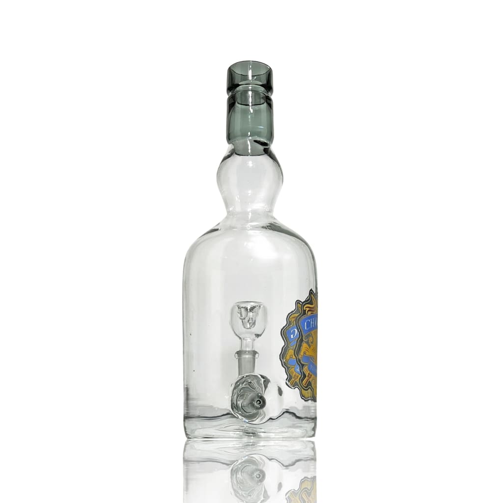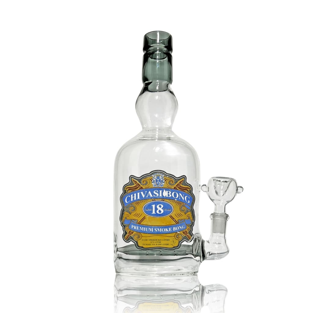 Enhance your smoking experience with the Chivas Liquor Bottle Water Pipe . This stunning water pipe is made from high-quality borosilicate glass in a heavy-duty liquor bottle design, and features a 14mm glass on glass downstem. Flower bowl and/or quartz dabbing rig sold separately. Downstem location may vary slightly.