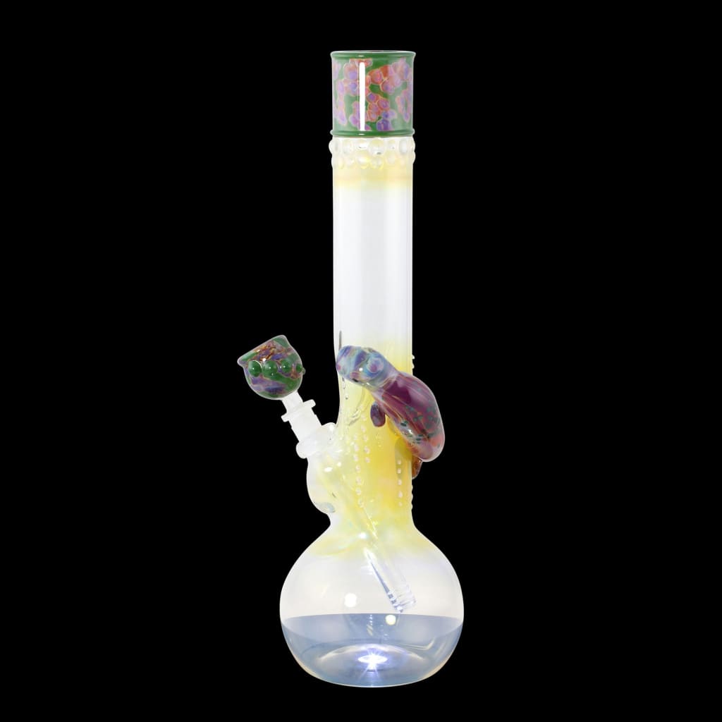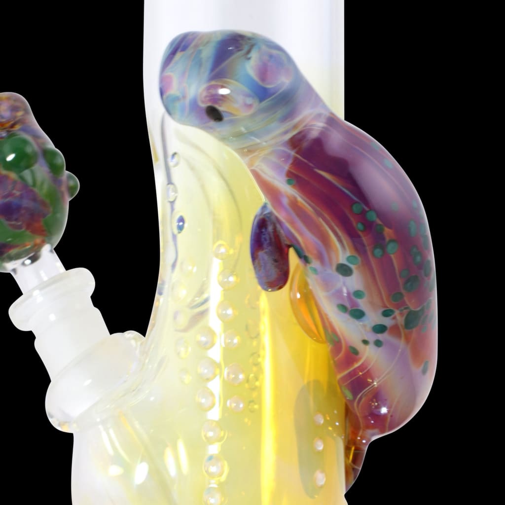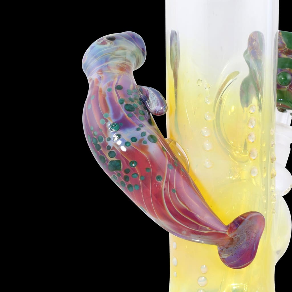 The Manatee Glass Water Pipe by Trident stands between 14 and 16 inches tall. It is fabricated on 50mm wide by 5mm wall thickness clear Pyrex. After the classic bubble base is blown, the glass is fumed with silver for Blue and Green color change. The mouthpiece is flared and the mid section offers an ice indent and an old school Mercury Seal joint. Each piece offers a matching color bowl and a glass sculpture of a Manatee wrapped around the neck.