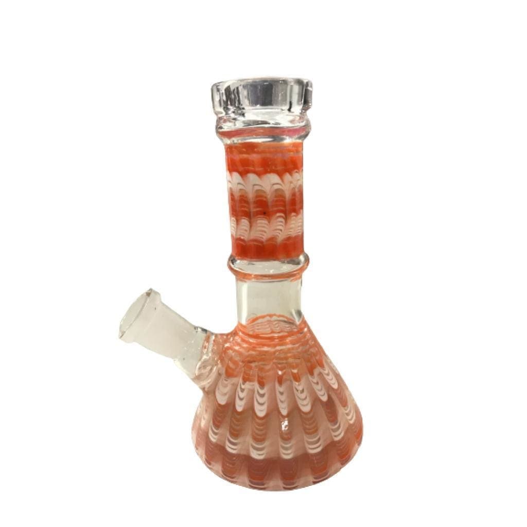 This 6" mini beaker bong has a beautiful Blue or green wrap & rake design made from thick borosilicate glass. Standing at just 6-inches tall this piece can be held in your hand or hit on a tabletop. The entire glass body is durable, with reinforcement on the straight neck and a fancy thick mouthpiece.