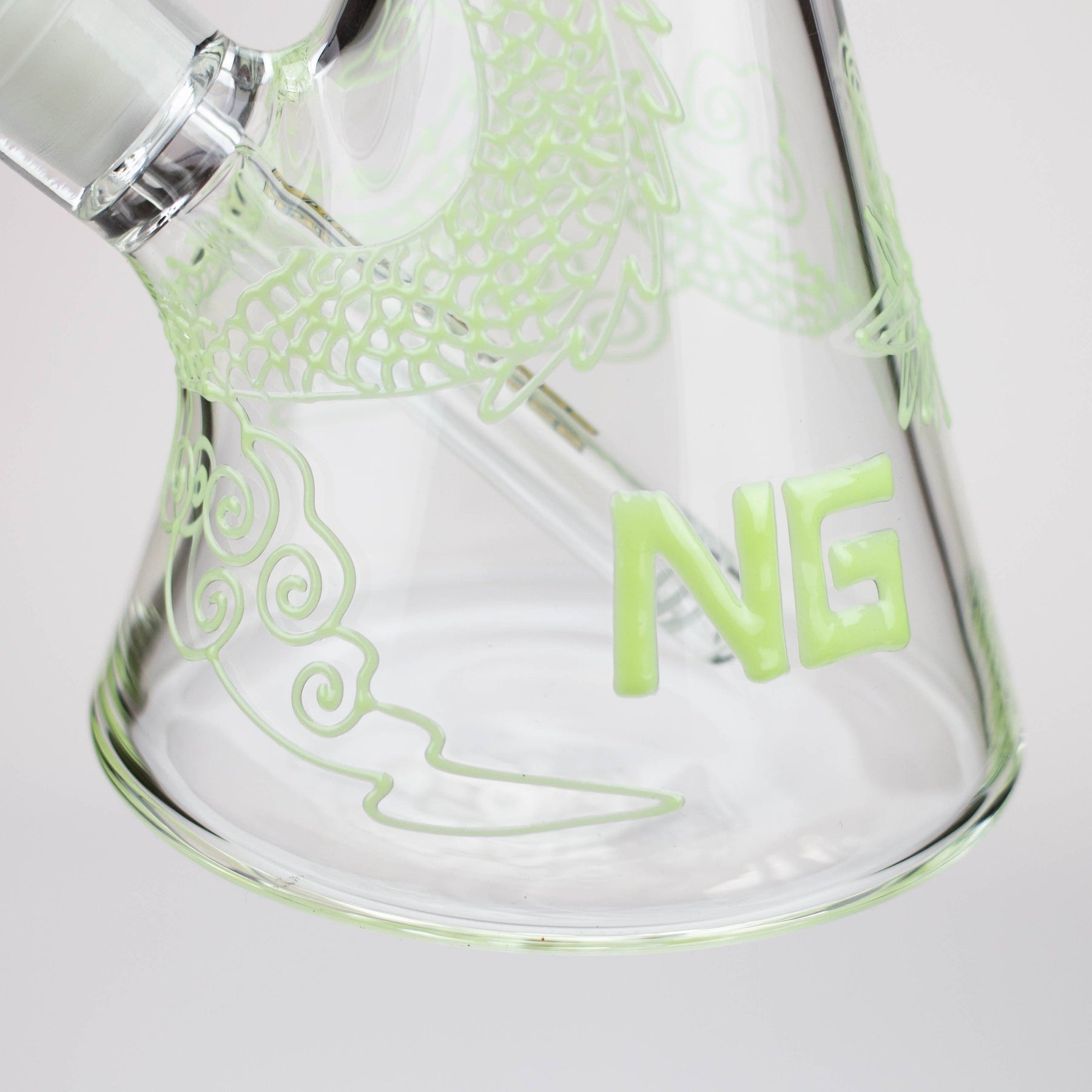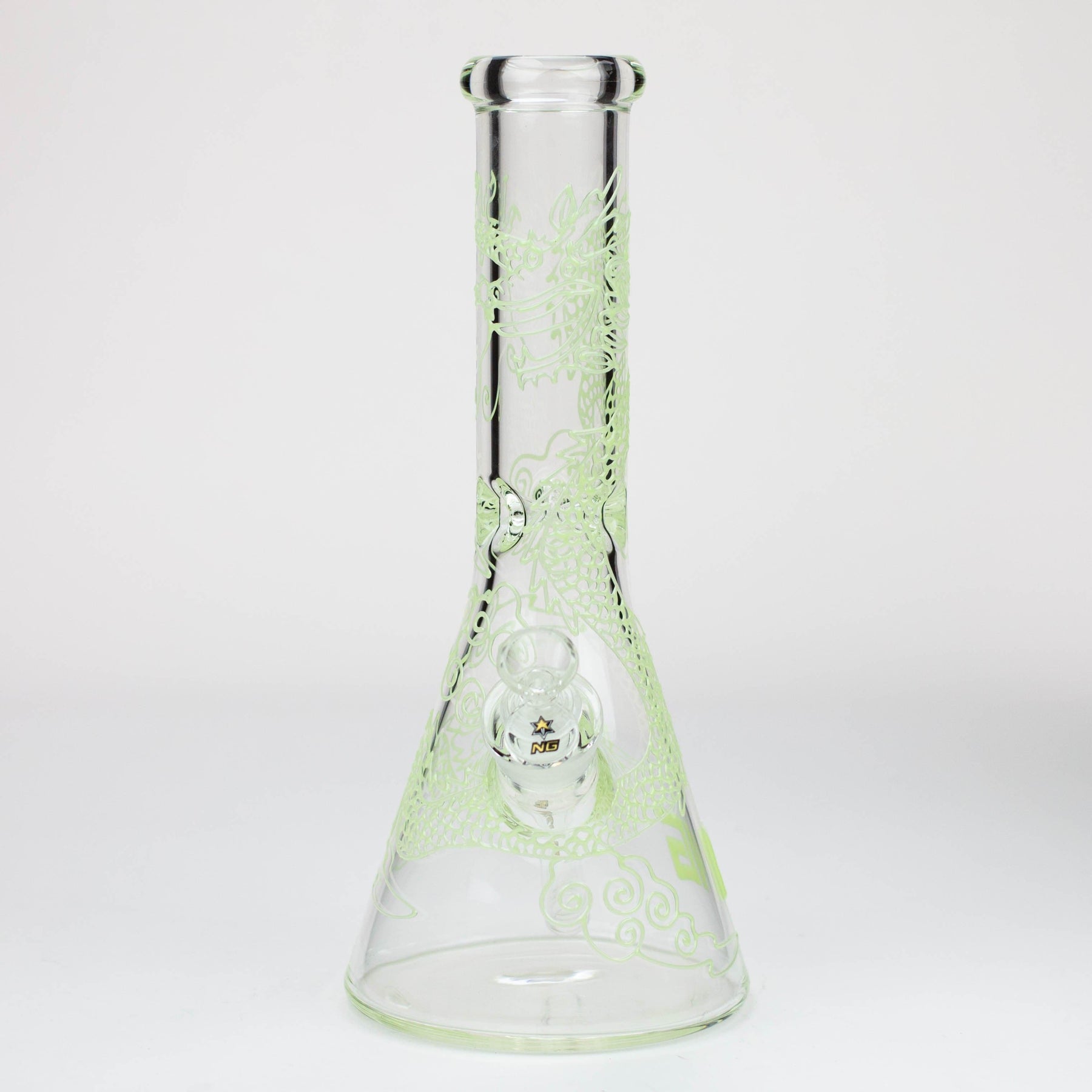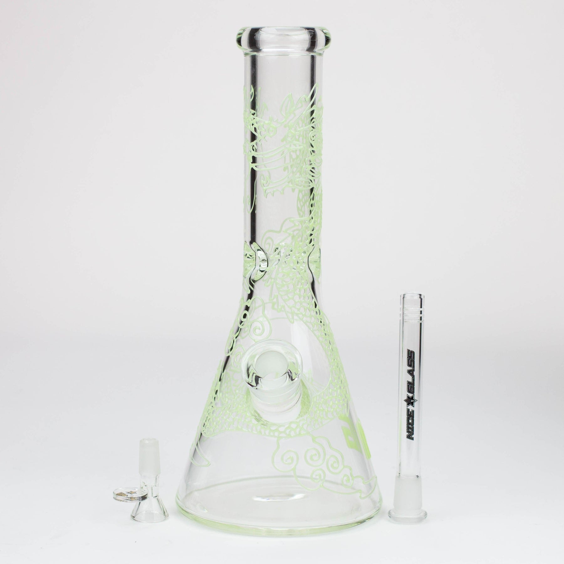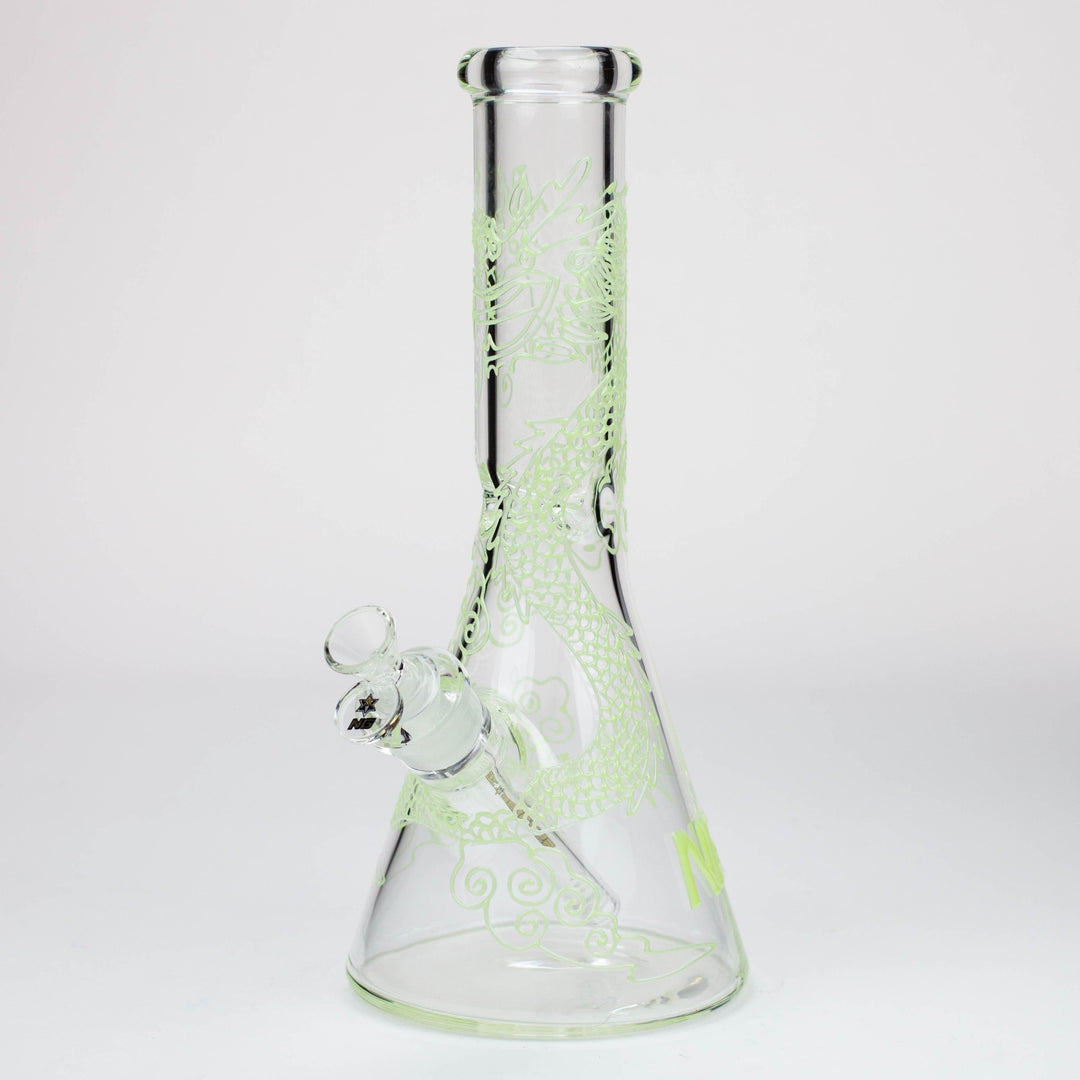 This 7mm thick clear glass bong features glow-in-the-dark dragon wrapping the beaker from top to base. It's a strong and hefty piece that's pretty difficult to knock over. Perfect for those with clumsy friends. It comes with a diffuser downstem, herb bowl and ice notches.