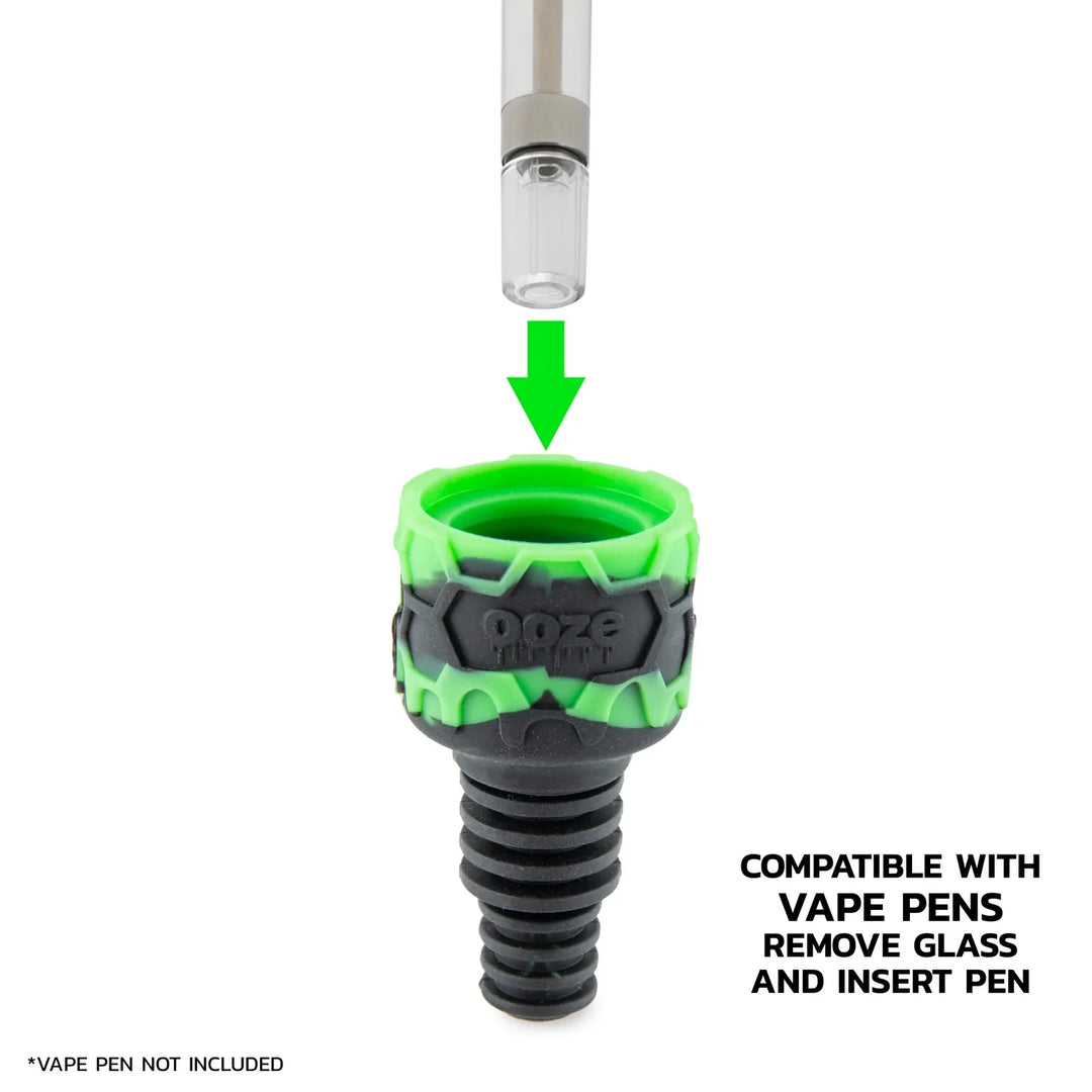 The Echo is part of a 3-piece series for the ultimate Ooze fans! This silicone glass hybrid is fun to use & spells out OOZE when paired up with the Ozone and Swerve pieces. It includes a matching Armor Bowl to use the piece as a bong. Simply pack the bowl with ground bud, insert it in the downstem, and light. The dab rig function has the same set up, but swap the Armor Bowl with the included 90 degree thermal quartz banger. The dab straw funtion makes this piece portable! Pull out the silicone mouthpiece and insert the titanium nail in the end. Heat the nail tip with a torch and dab out of the small glass dish that's included. The 4th way to use the Echo is as a water filtration piece for your favorite Ooze pen! Take a big bong rip of your oil cartridge by removing the glass bowl from the Armor Bowl. Insert the cartridge tip in the grooves inside the bowl, press the battery button, and take a rip!