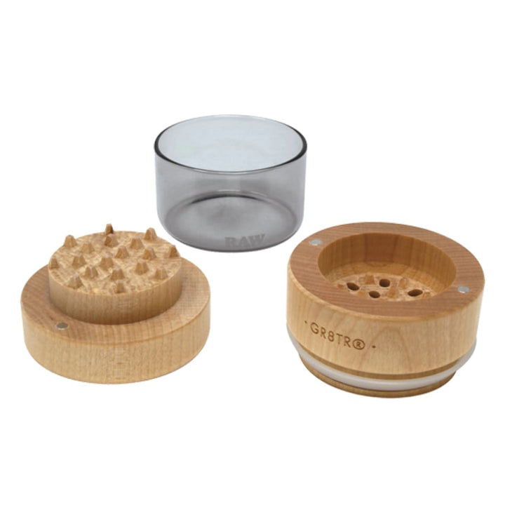 The RAW Natural Wood & Glass Storage Grinder is made from the simple earth materials of pressed wood and impact-resistant glass, with a 65mm diameter and fine grind. This is the natural way to grind!