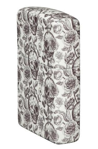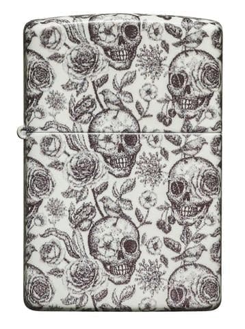Completely enveloping this design are skulls with floral accents. This beautifully haunting Skeleton design uses Zippo's 540 Color process, which allows for complete coverage of the lighter's surface with precision artwork. But that's not all! Flip off the lights to see this lighter glow-in-the-dark, making this piece truly one of a kind! Comes packaged in a gift box. For optimal performance fill with Zippo lighter fuel.